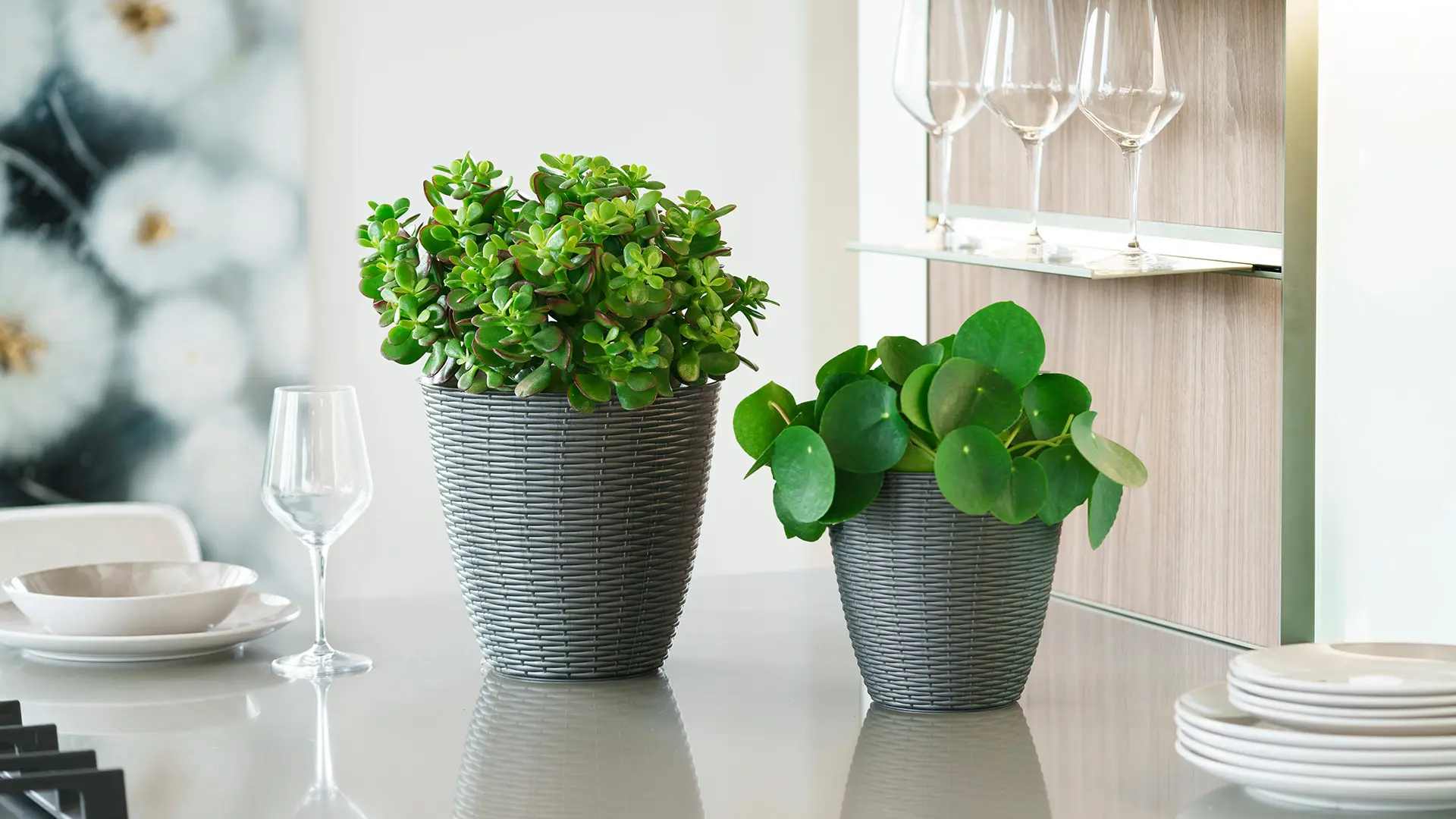 Vaso ciotola in plastica con texture simil paglia e sottovaso a riserva d’acqua.