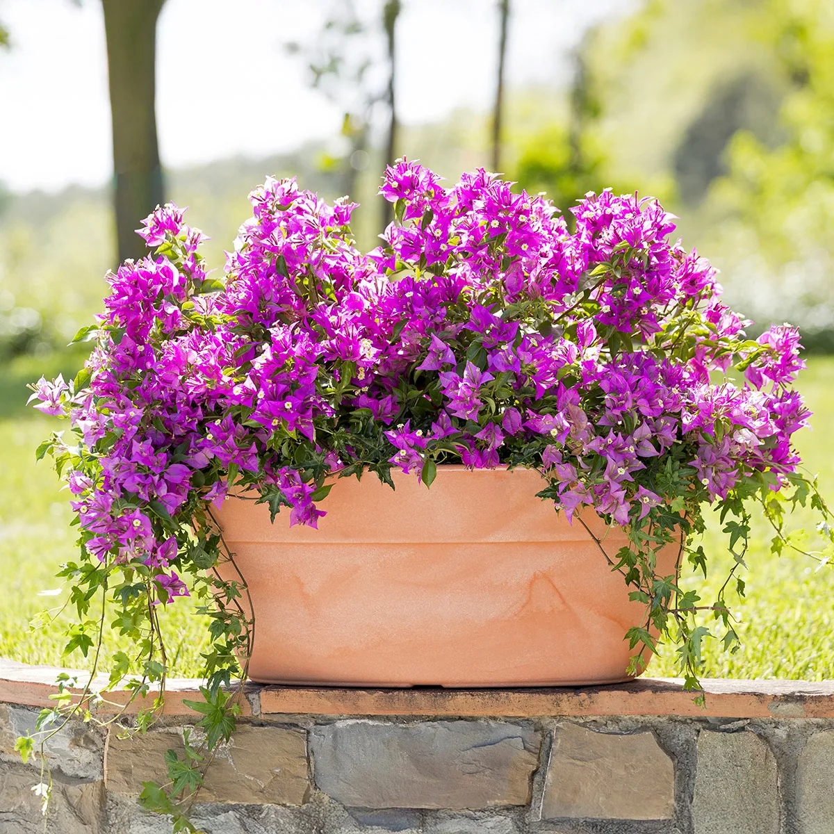 Fioriera ovale in plastica corredata di sottovaso a riserva d’acqua.