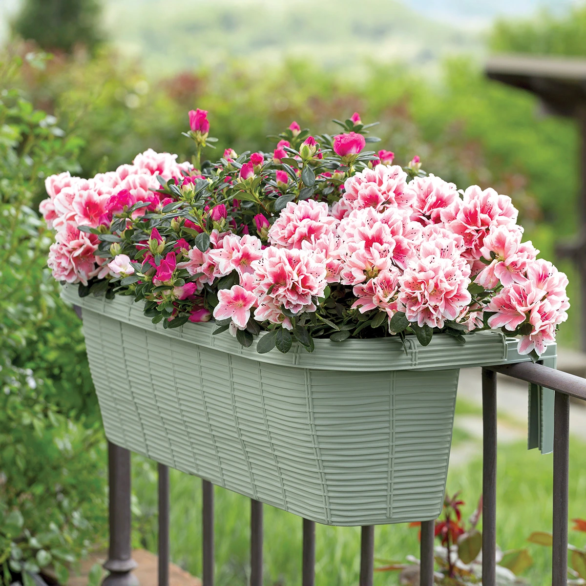 Fioriera da ringhiera in plastica con bracci regolabili e texture simile alla paglia intrecciata.