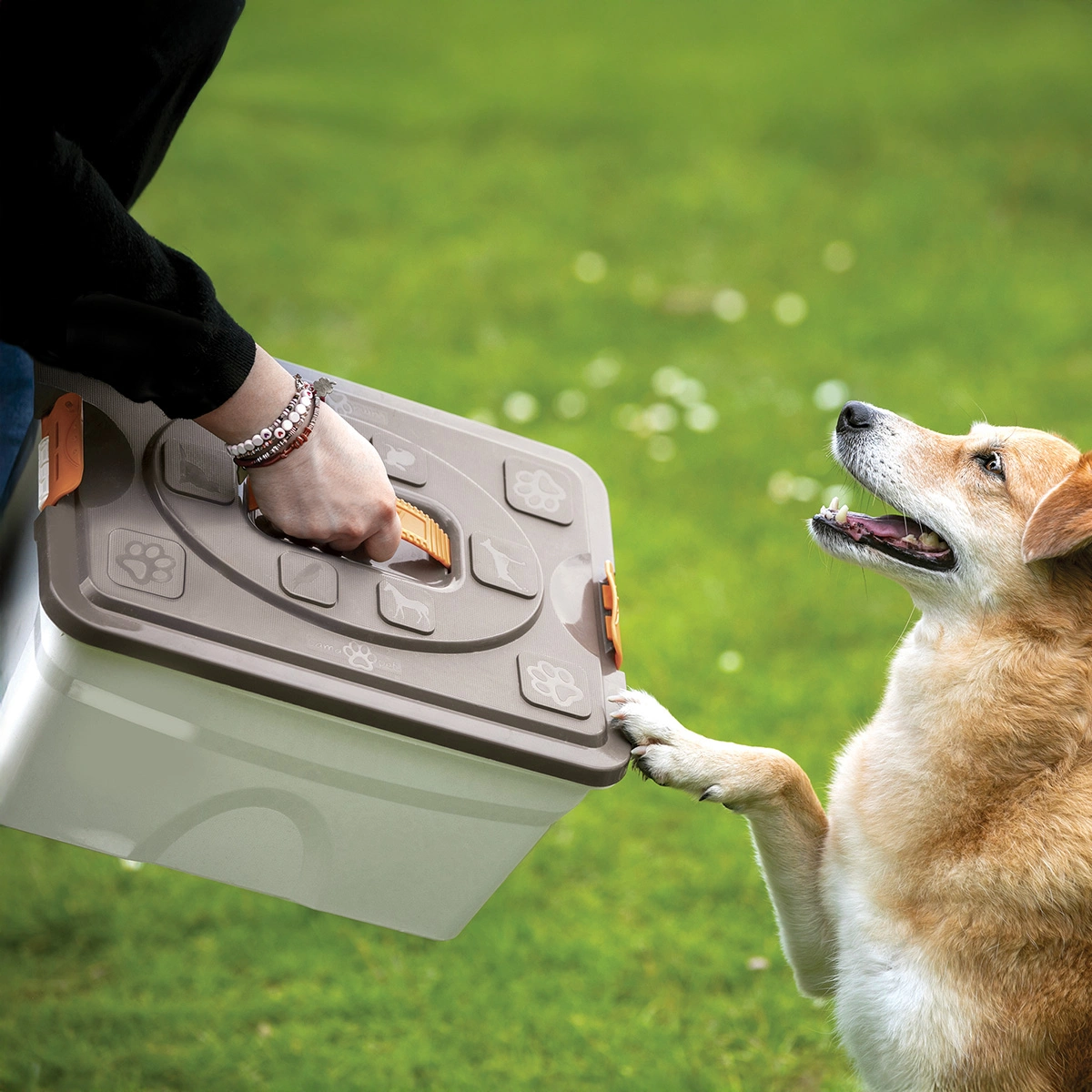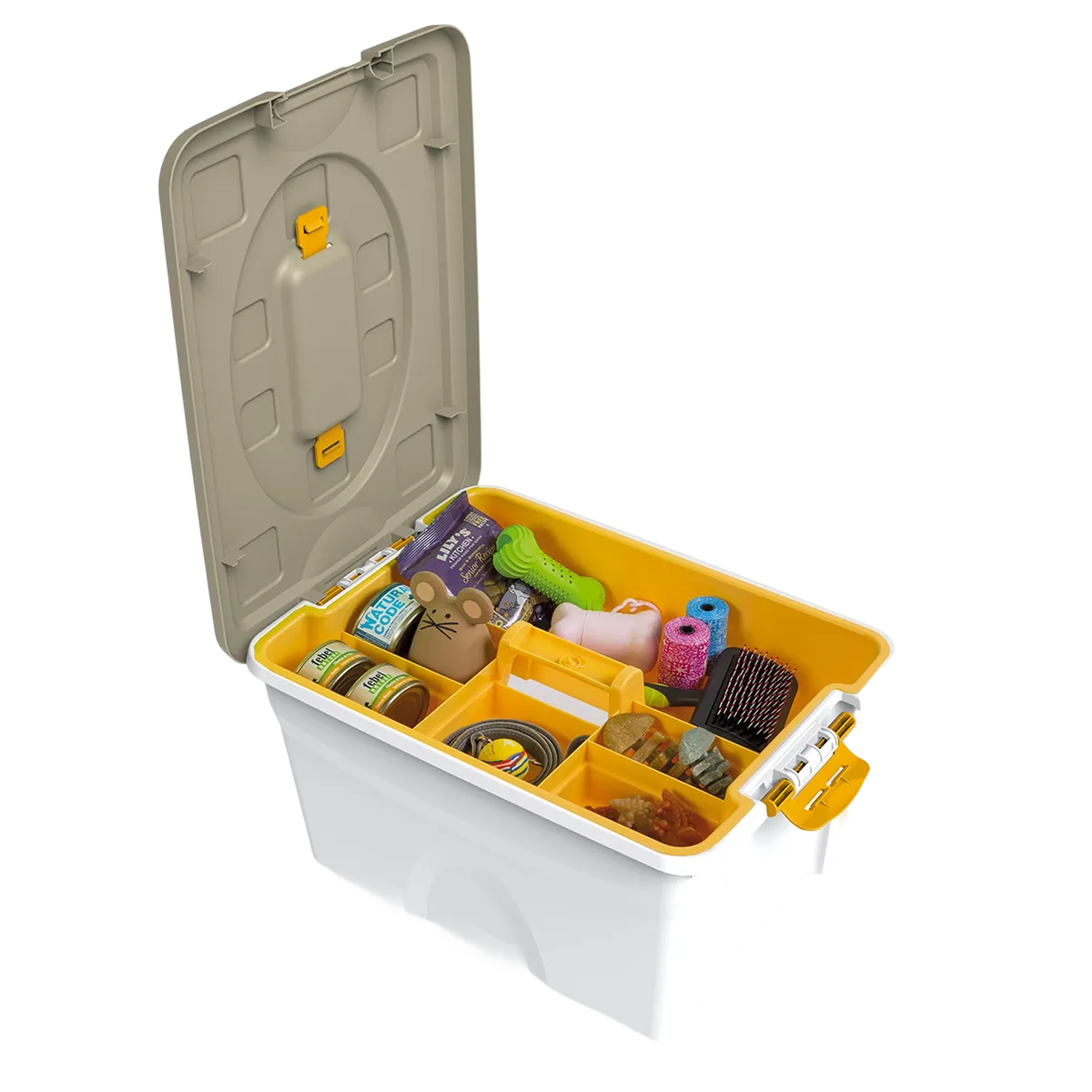 Contenitore in plastica resistente per organizzare e trasportare oggetti per animali.