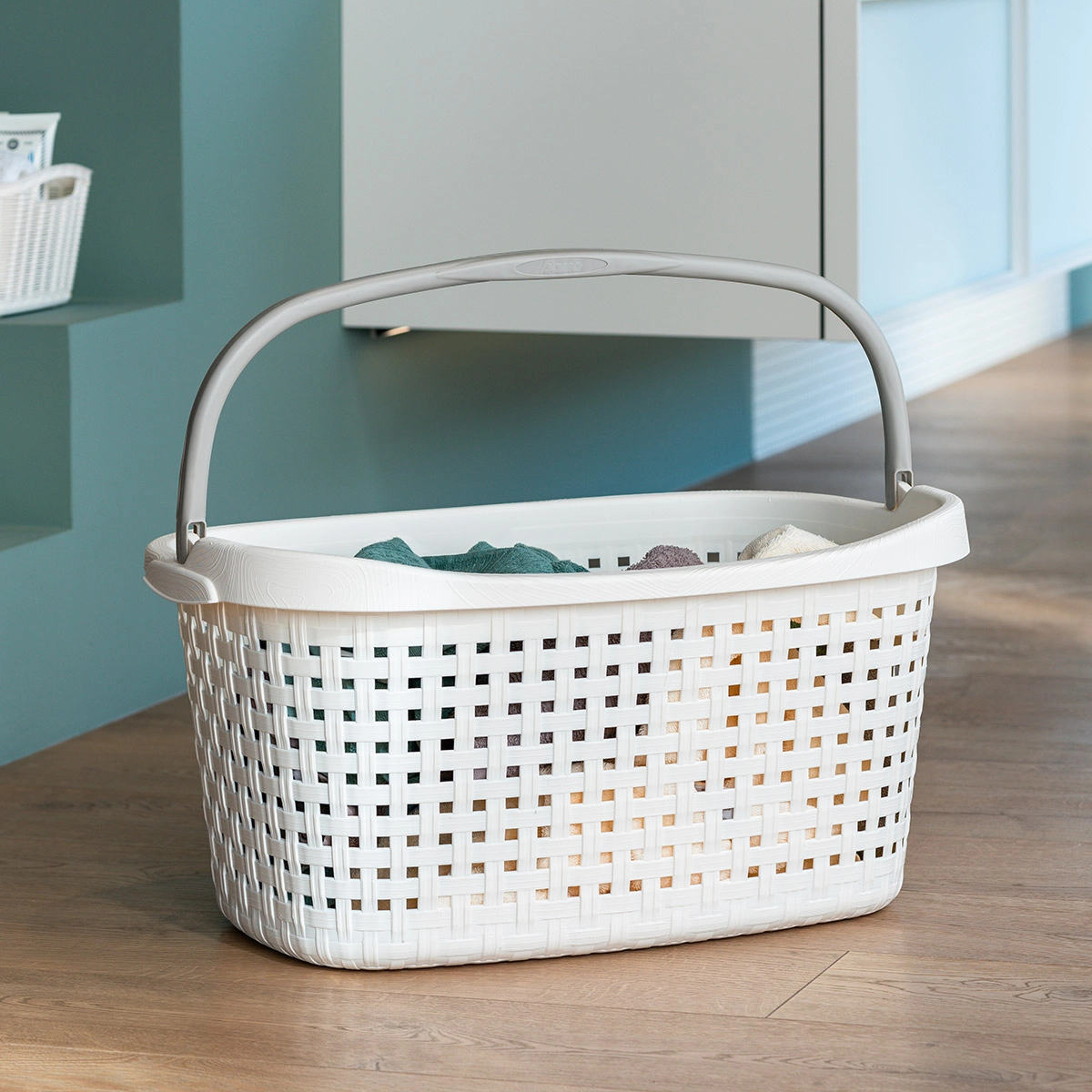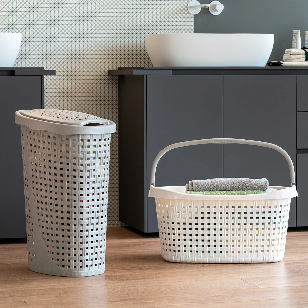 Cesta per biancheria dal design ergonomico con tre pratiche maniglie.