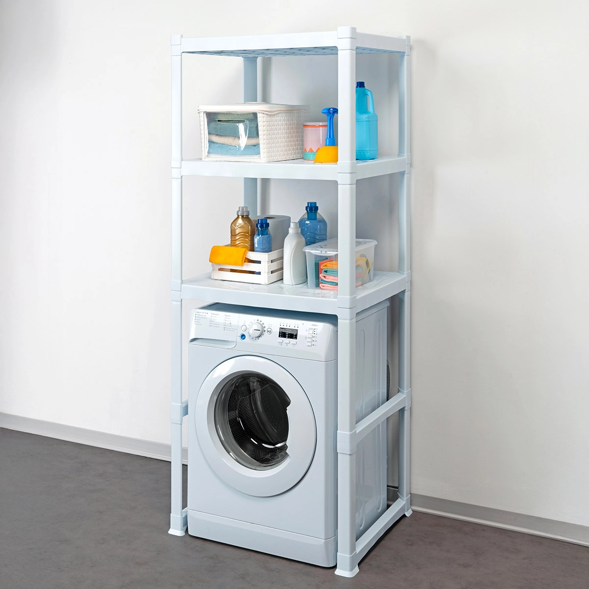 Scaffale lavatrice salvaspazio con 3 ripiani dalla portata di 60 kg l’uno.
