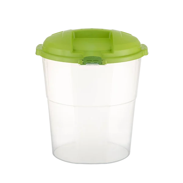 Plastic containers, stackable, 60 liters, with hinged lid and snap closure.