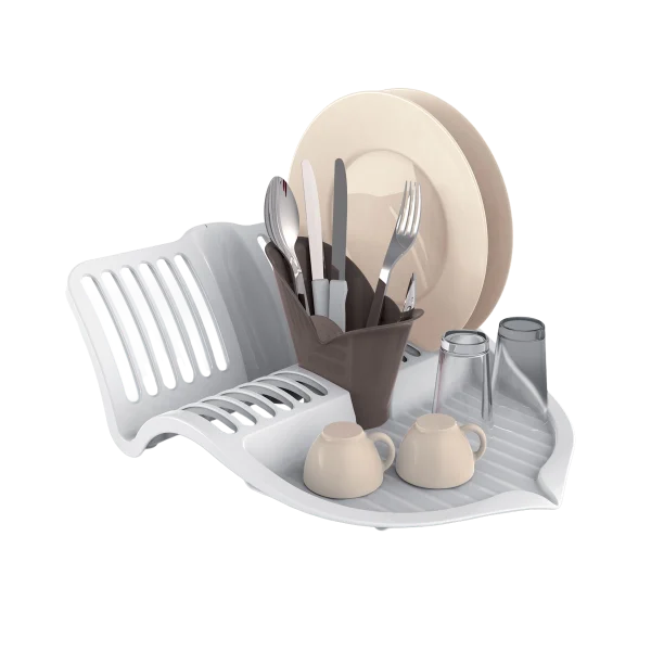 All-in-one plastic dish rack complete with glass holder and cutlery compartment. A versatile, space-saving accessory for a well-organized kitchen.
