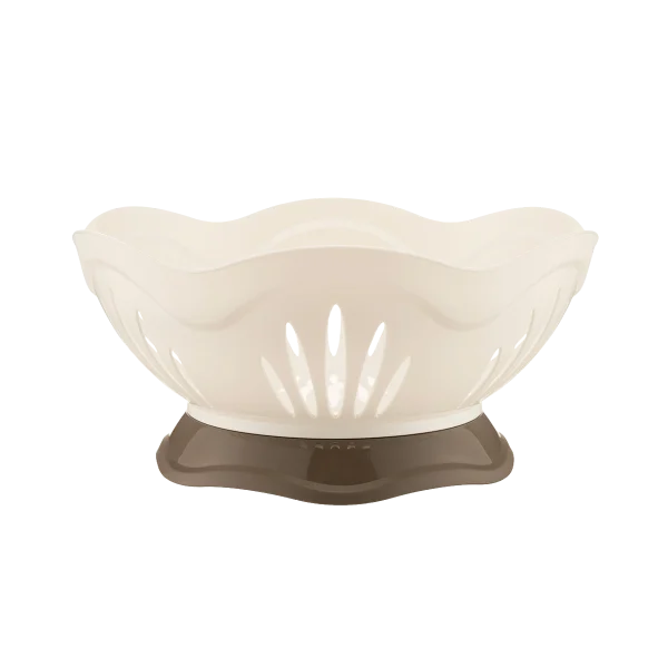 Plastic fruit bowl with container and base. Remove the base to turn it into a practical bread basket. The base can be used as a candy or chocolate dish.
