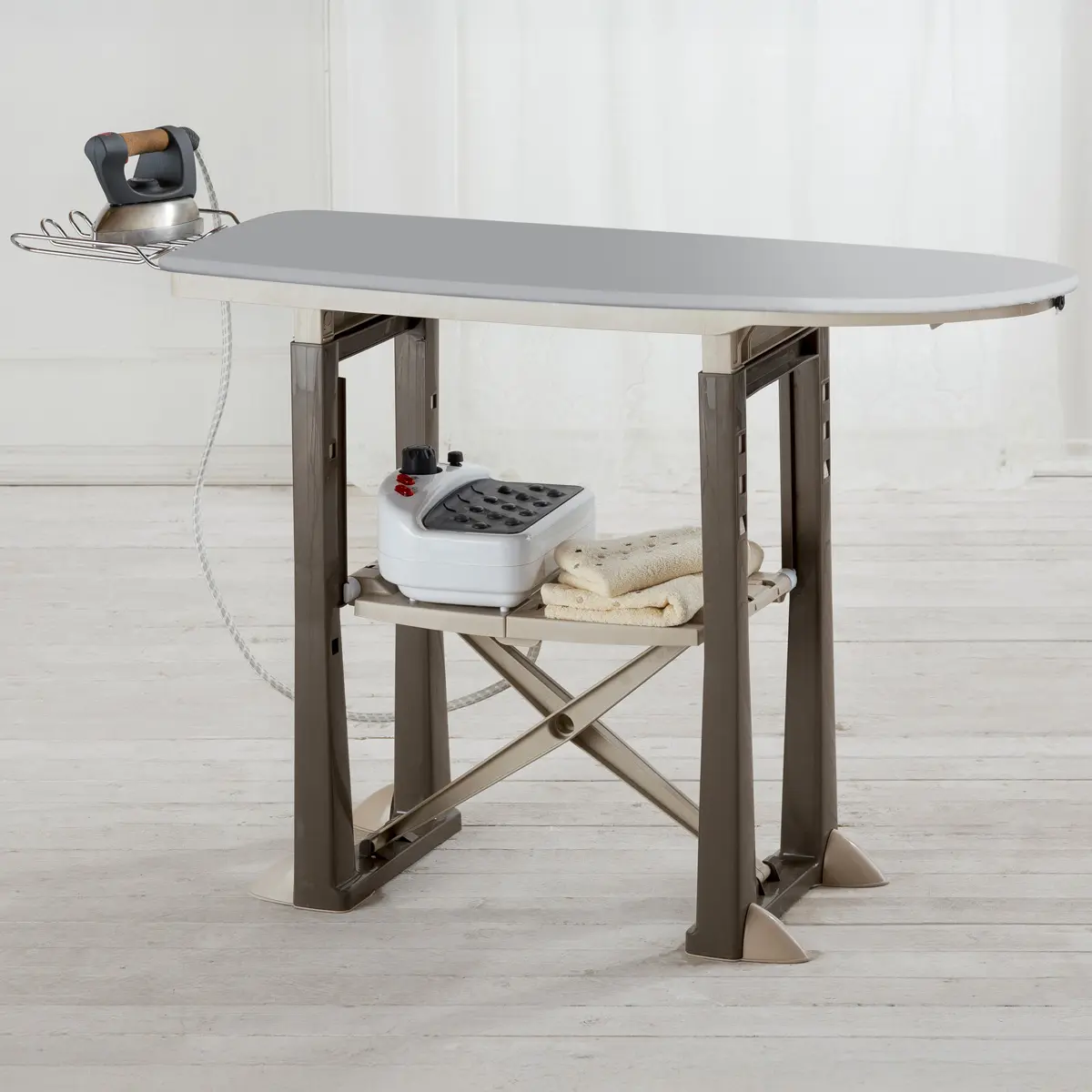 Ironing board adjustable to 3 positions with breathable surface and storage shelf. When closed, it stands upright on its own and takes up minimal space.