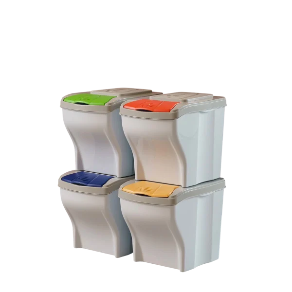 Bins for separate waste collection designed to neatly recycle organic waste, paper, plastic, glass, and residual urban waste. Thanks to the four 20-liter containers.