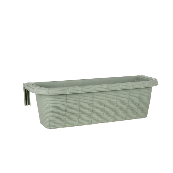 Railing planter made of plastic with adjustable arms from 3 to 11 cm and a woven straw-like texture. Resistant to sunlight and temperature changes. 5-year warranty.