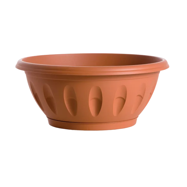 Bowls with saucers made of plastic for planting succulents, flowering plants, and herbs. They are guaranteed for 5 years to withstand UV rays, temperature changes, and impacts.