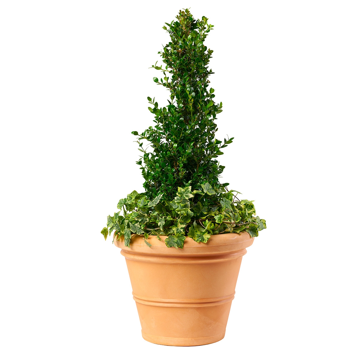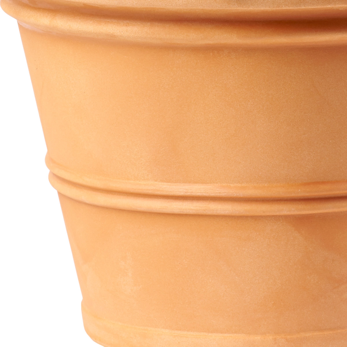 Lightweight and sturdy terracotta-colored resin pot, resistant to impact and UV rays. Perfect for balconies, terraces, or gardens with a classic and durable design. 10-year warranty. Manufactured using rotational molding technology.