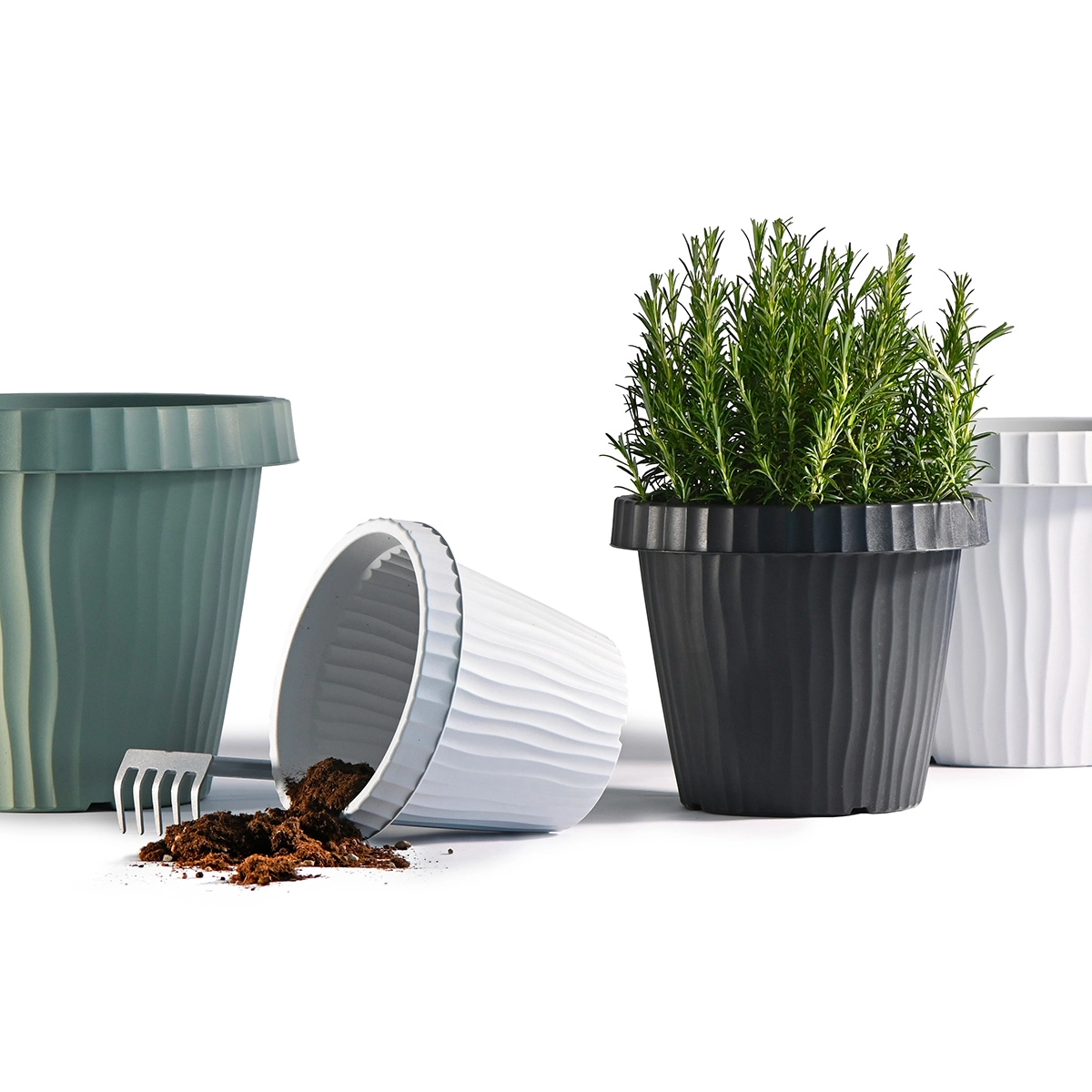 Coordinated line of plastic pots characterized by an innovative wave design: a detail that combines aesthetic appeal and care for greenery to allow every plant to grow luxuriantly. 5-year warranty.