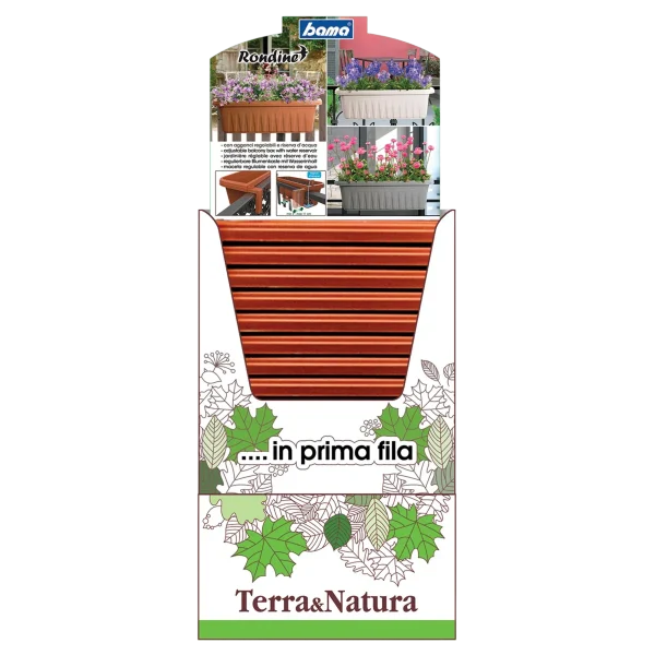 Midi-sized display for 24 Rondine 50 cm balcony planters designed to capture attention at every point of sale. Compact, colorful, and perfect for large-scale retailers and specialty stores.