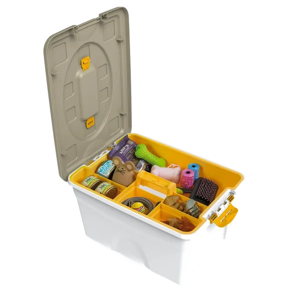 Durable plastic container for organizing and transporting items, food, and accessories for dogs and cats. Also useful for travel, fairs, and exhibitions.