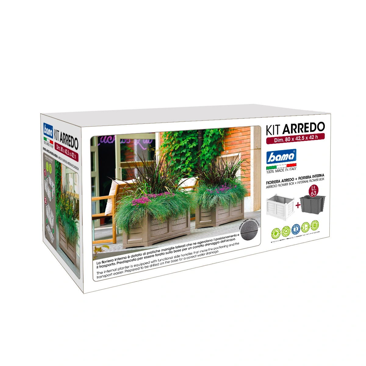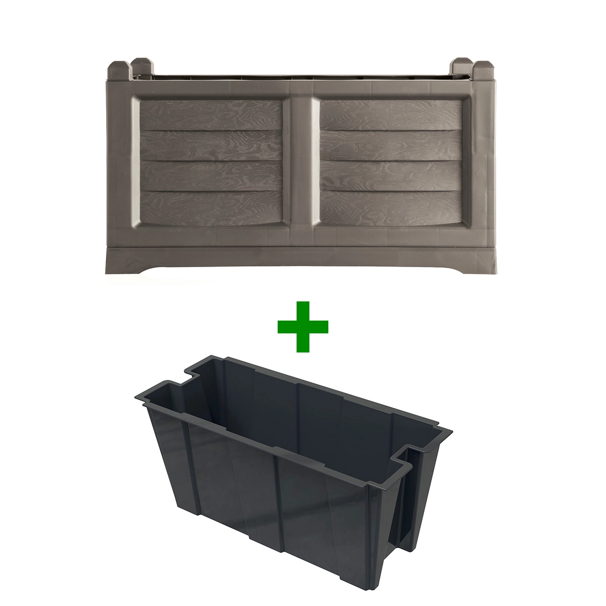 Fioriera rettangolare da esterno abbinata a una capiente vasca da inserire a incastro al suo interno. Un kit completo per arredare con stile gli spazi domestici o lavorativi. Garantita 5 anni.