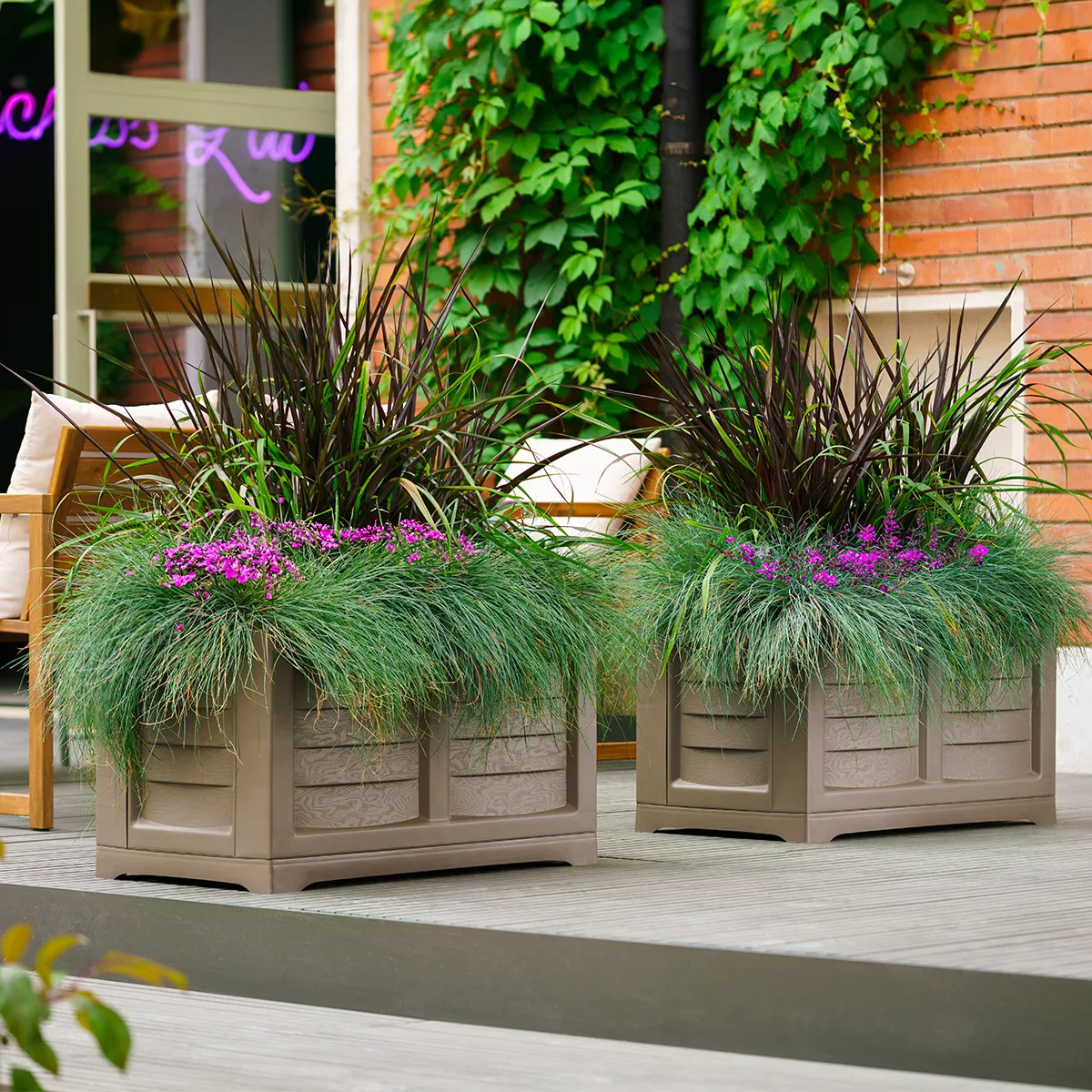 Fioriera rettangolare con sottovaso e texture simile al legno.