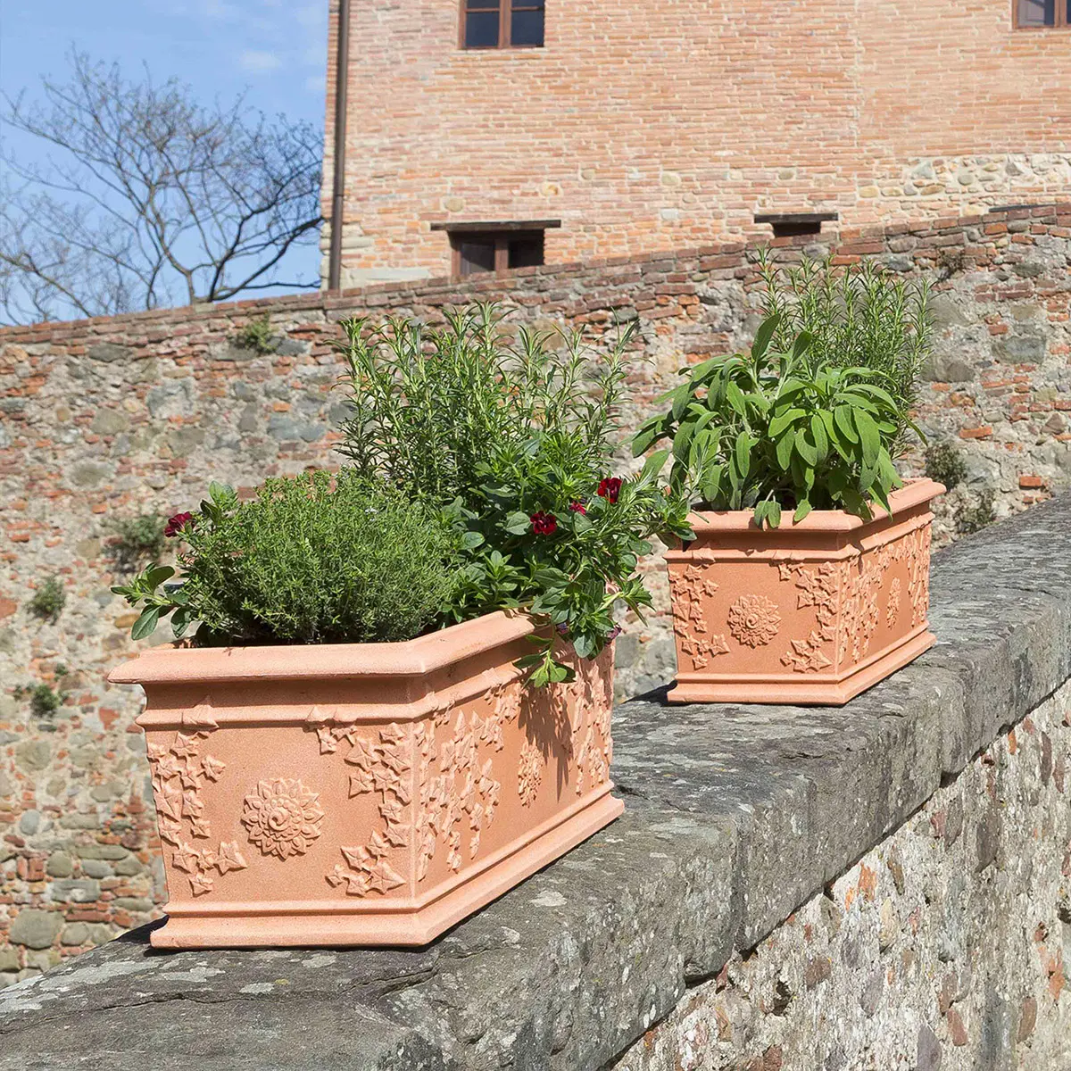 Fioriera rettangolare da esterno con una capiente vasca a incastro al suo interno.