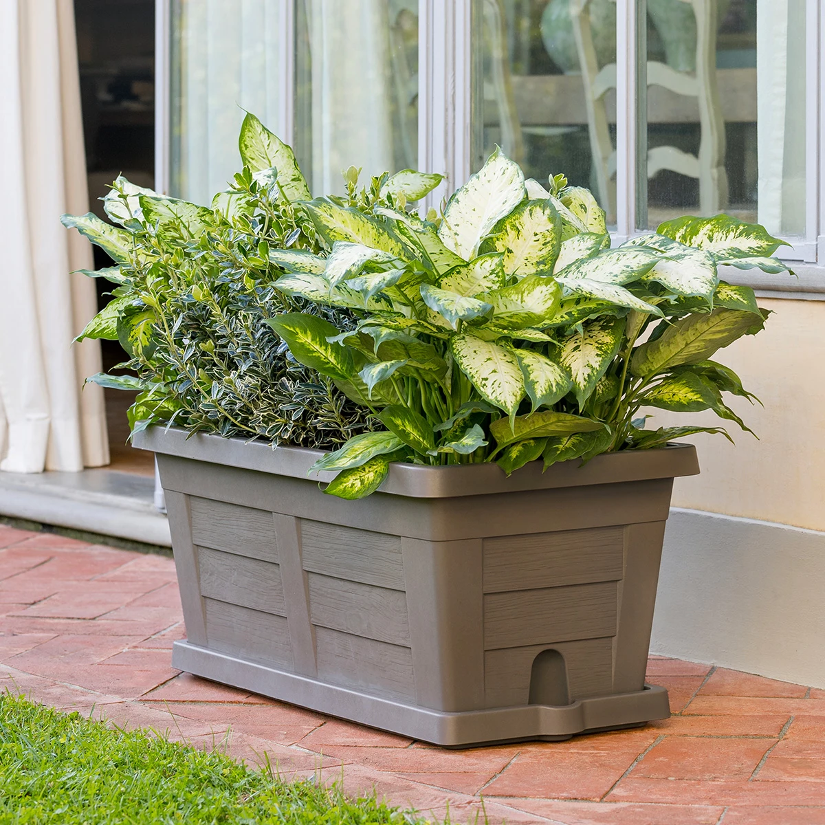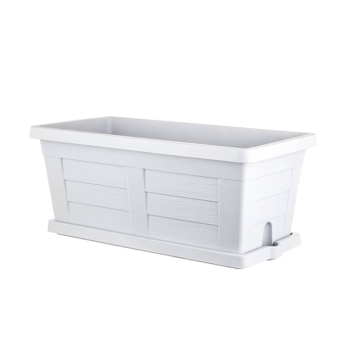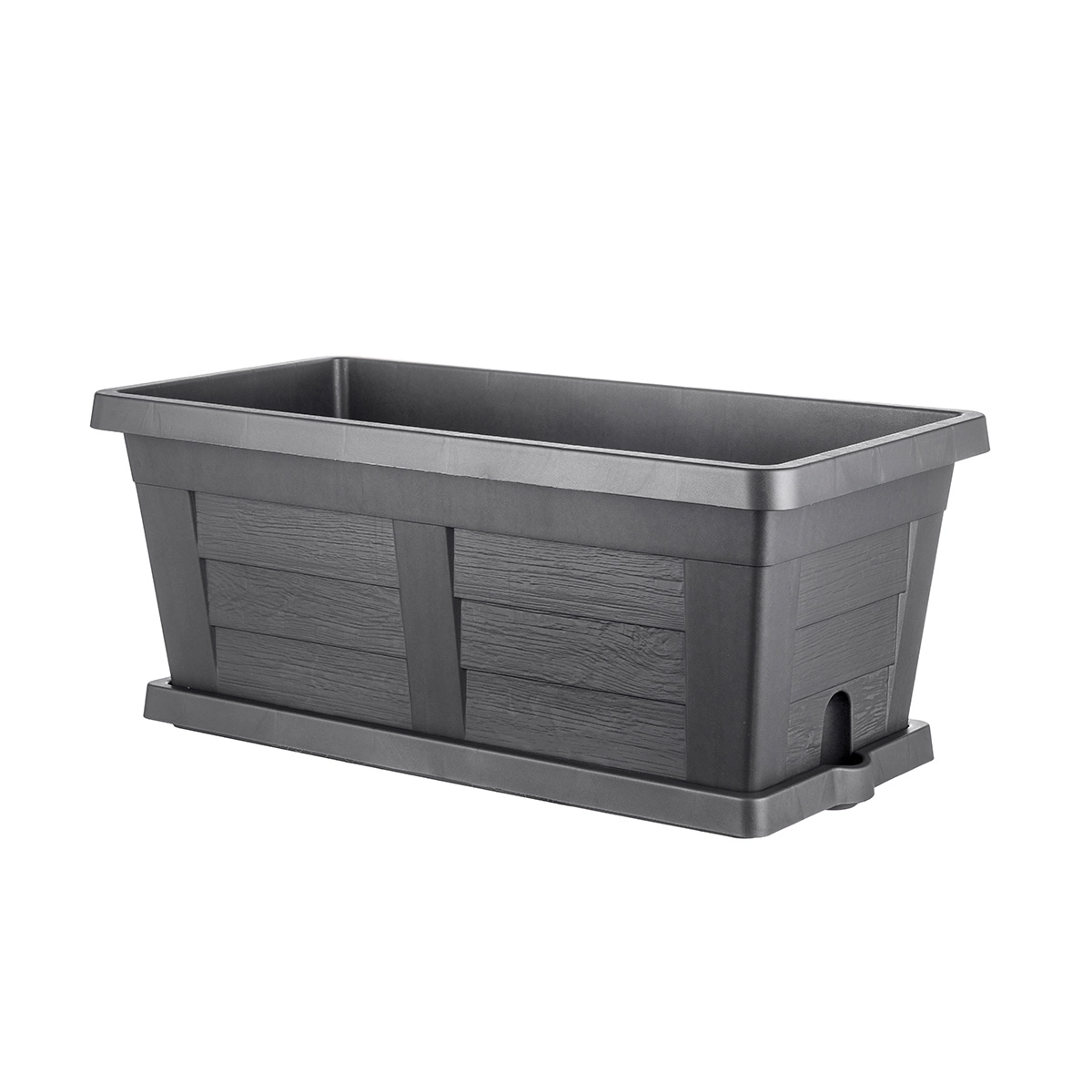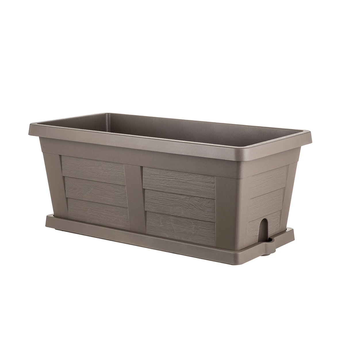 Fioriera rettangolare con sottovaso e texture simile al legno. Da sistemare in giardino o sul terrazzo per coltivare fiori e piante con stile. Garantita 5 anni.