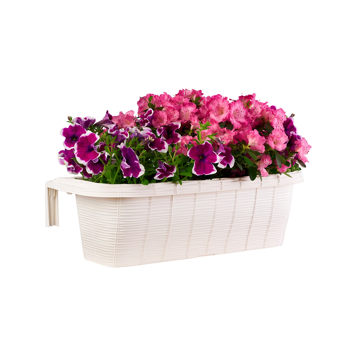 Fioriera da ringhiera in plastica con bracci regolabili da 3 a 11 cm e texture simile alla paglia intrecciata. Resistente ai raggi solari e agli sbalzi termici. Garantita 5 anni.