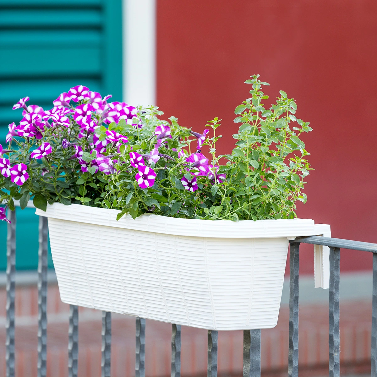 Fioriera da balcone con supporto di metallo e sottovaso integrato.