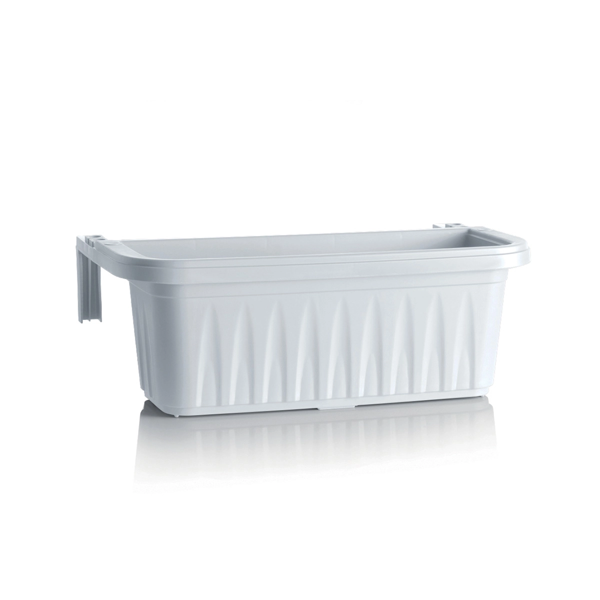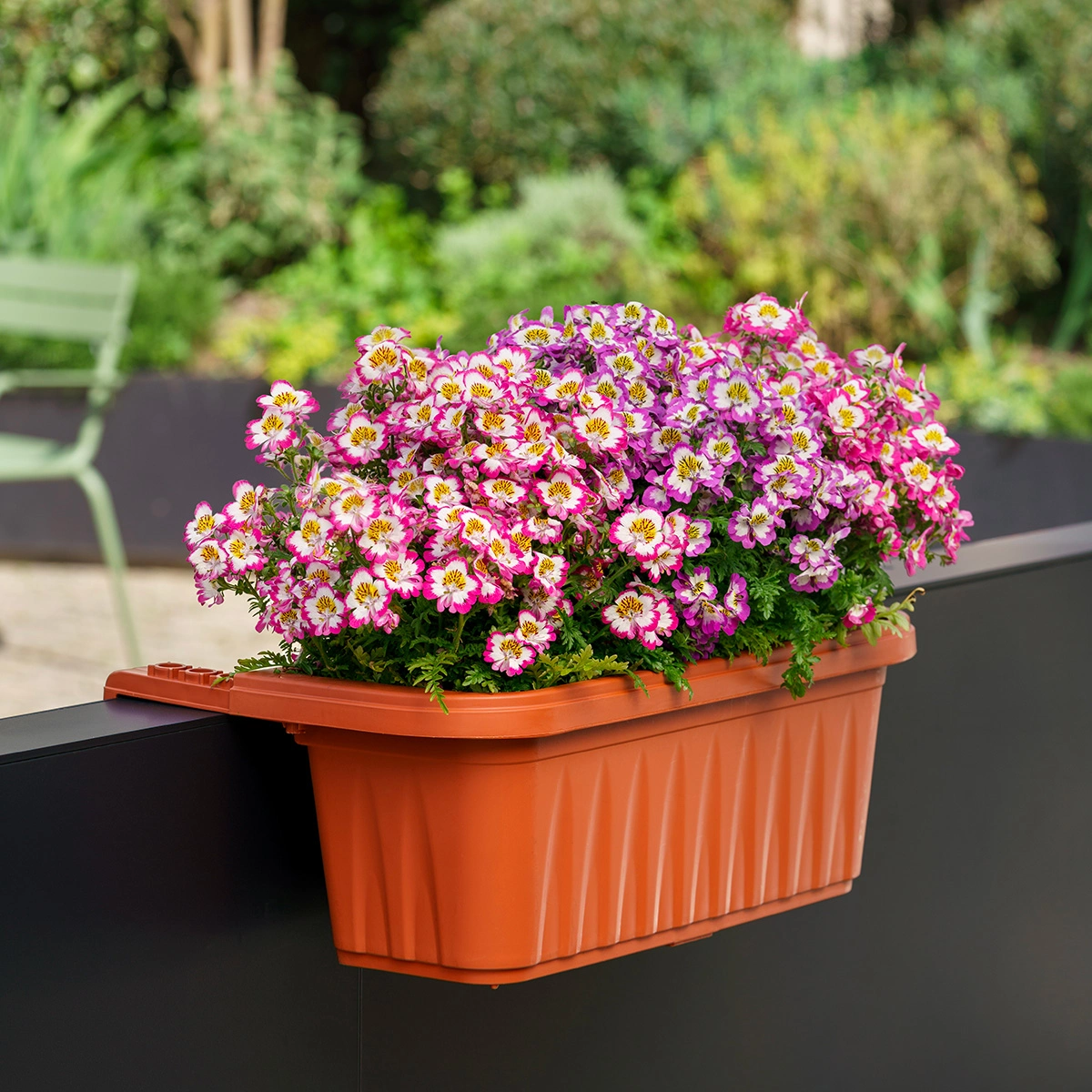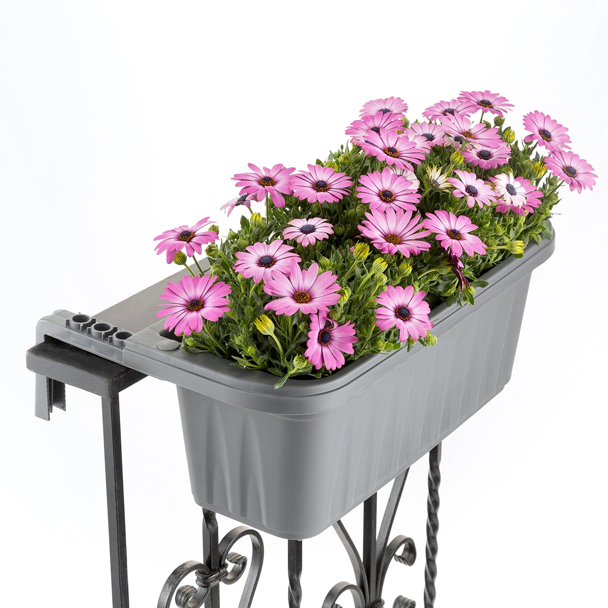 Fioriera da balcone con supporto di metallo e sottovaso integrato.
