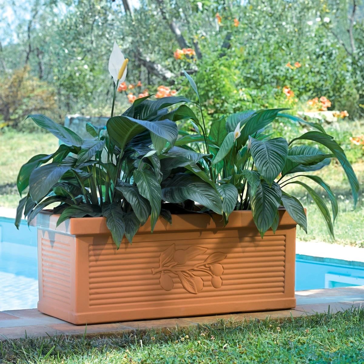 Vaso fioriera caratterizzata da un'elegante decorazione a forma di ramo d’olivo.