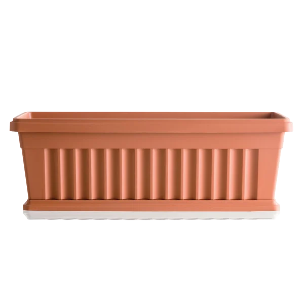 Fioriere in plastica con sottovaso integrato e superficie scanalata. Perfette per il terrazzo o il giardino, uniscono praticità e resistenza con la garanzia di 5 anni.