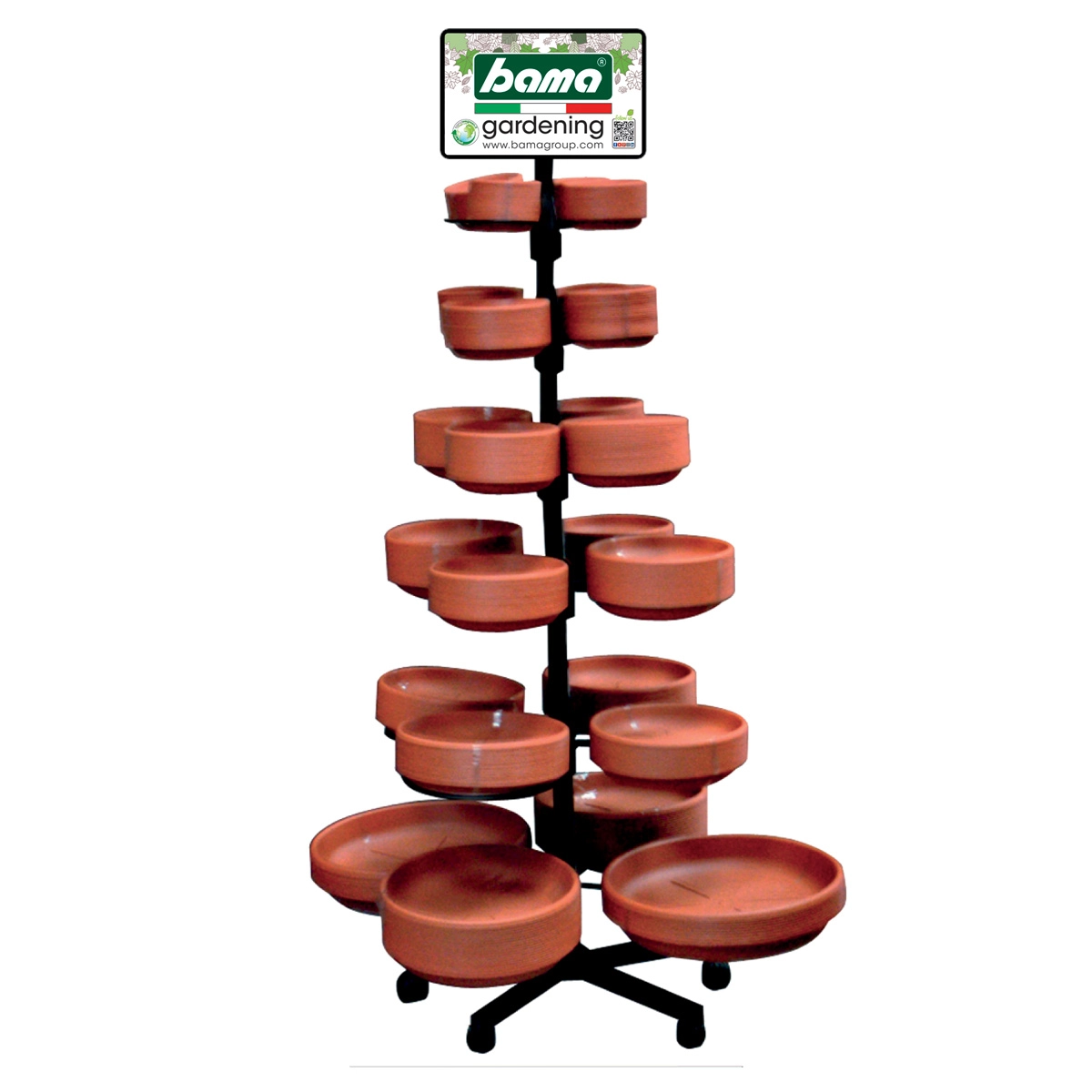 Espositore in metallo robusto per sottovasi di diverse misure. Una soluzione pratica per organizzare, promuovere e valorizzare lo spazio espositivo.