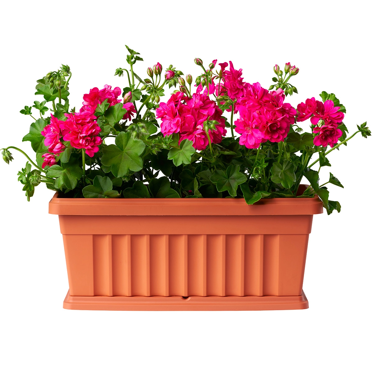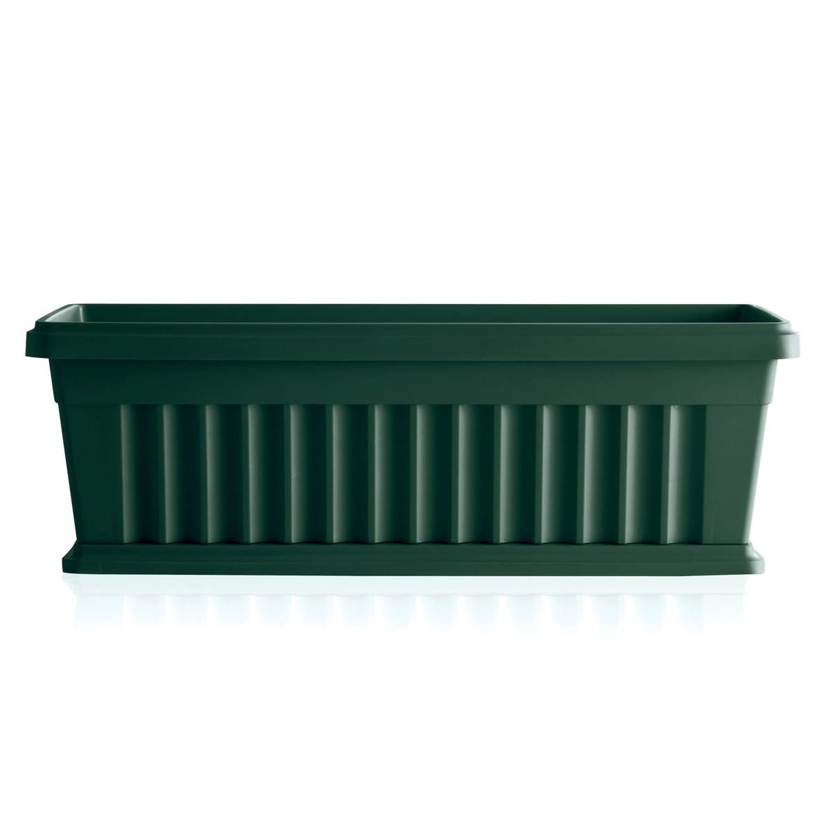 Fioriera da balcone con supporto di metallo e sottovaso integrato.