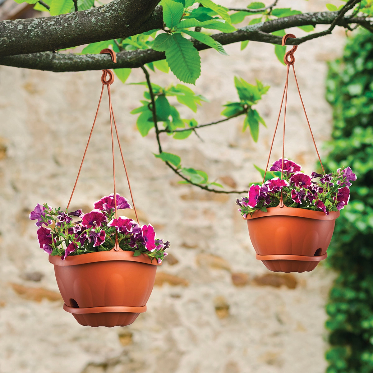 Il gancio si fissa in pochi istanti. Il sottovaso trattiene l’acqua in eccesso e riduce il rischio di sgocciolamenti.