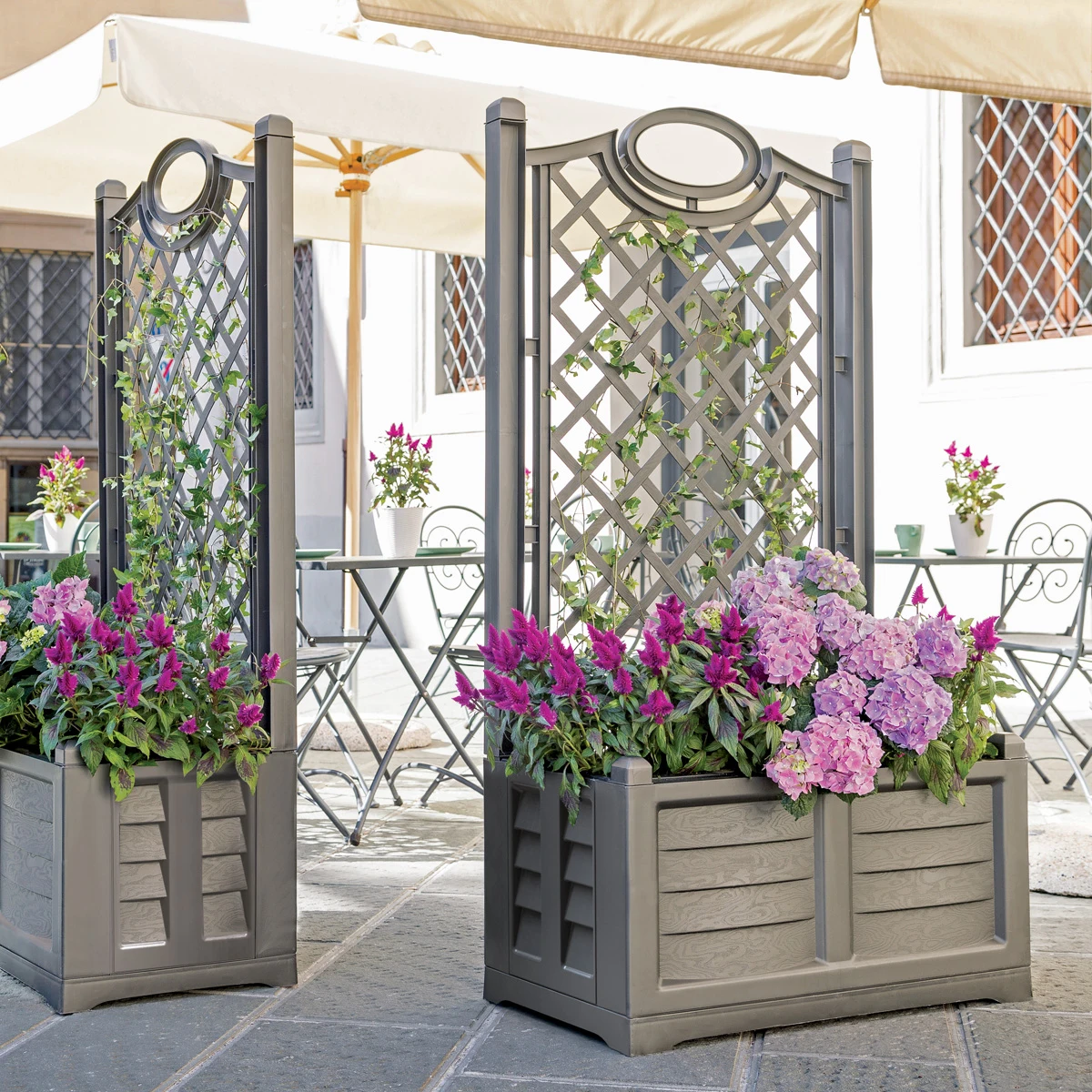 Fioriera con spalliera in plastica effetto legno, da usare a parete o come separé.