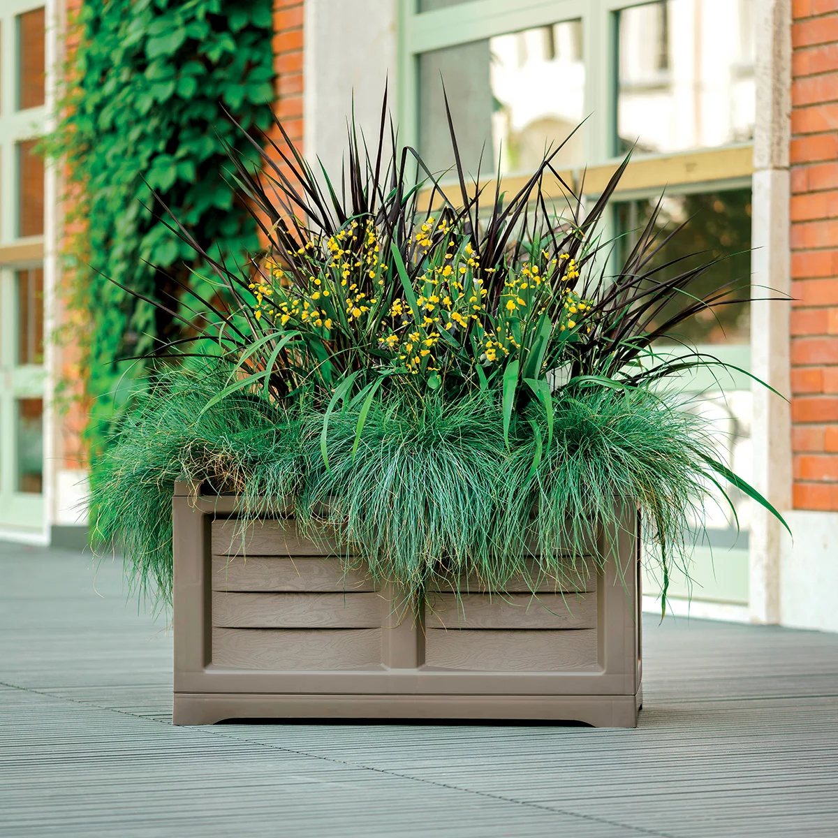 Fioriera rettangolare da esterno con una capiente vasca a incastro al suo interno.