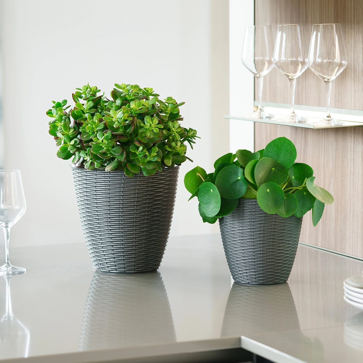 Portavaso in plastica con lavorazione che ricorda la paglia intrecciata. Leggero, pratico, perfetto per proteggere e valorizzare ogni pianta sia in interno che in esterno. Garantito 5 anni.