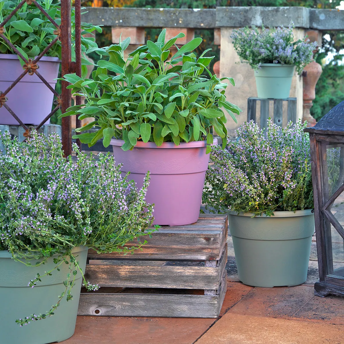 Assicurano una sede accogliente per piante aromatiche, fiori e arbusti. In più, con la bordura decorata e le originali tonalità ocra, salvia, lavanda e cielo, creano degli angoli vivaci e allegri ovunque.