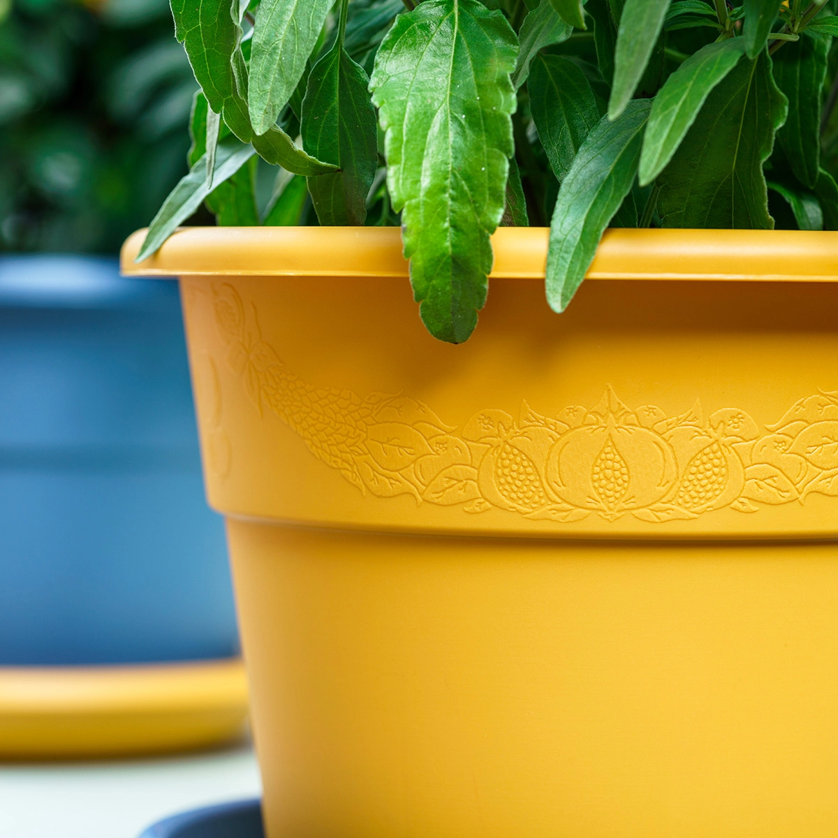 Vasi colorati in plastica con decorazione floreale in rilievo sul bordo. Garantiti 5 anni per resistere ai raggi UV, agli urti e alle intemperie. Nati per durare, creati per aggiungere bellezza!