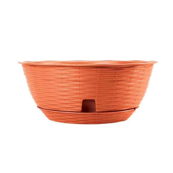 Vaso ciotola in plastica con texture simil paglia e sottovaso a riserva d’acqua. Da scegliere per creare angoli green sia in interno che in esterno. Garantito 5 anni.