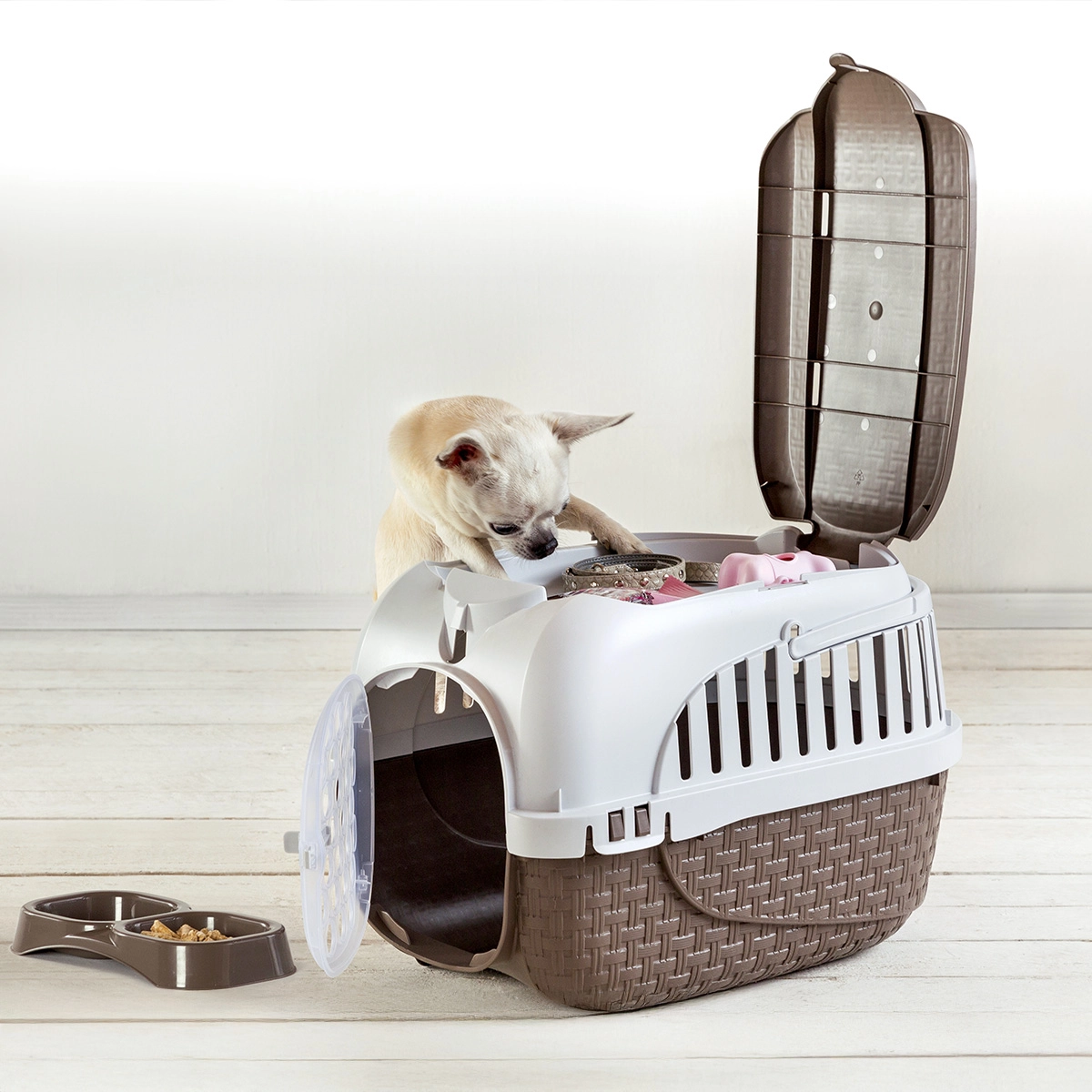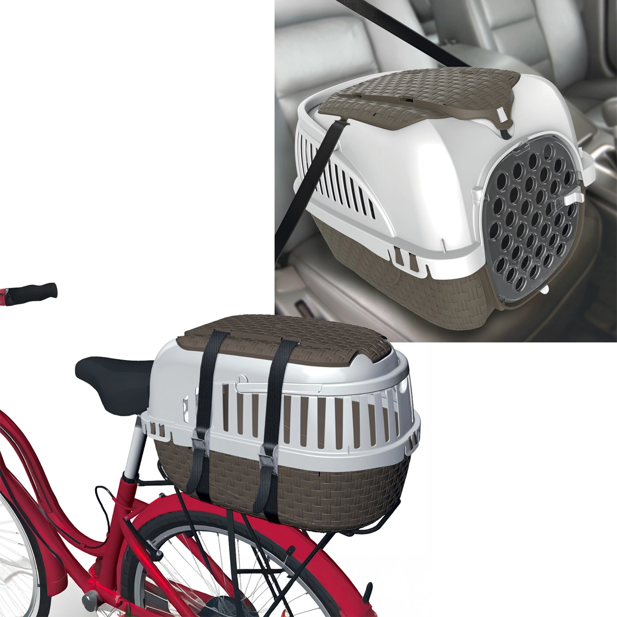 Dotato di pratica maniglia, vano portaoggetti, doppia ciotola da viaggio, tripla chiusura di sicurezza e passaggi per cintura o cinghie da bici e motorino.Ma non finisce qui: lo sportello removibile consente di usare il trasportino come cuccia tutto l’anno, basta aggiungere un soffice cuscino.
