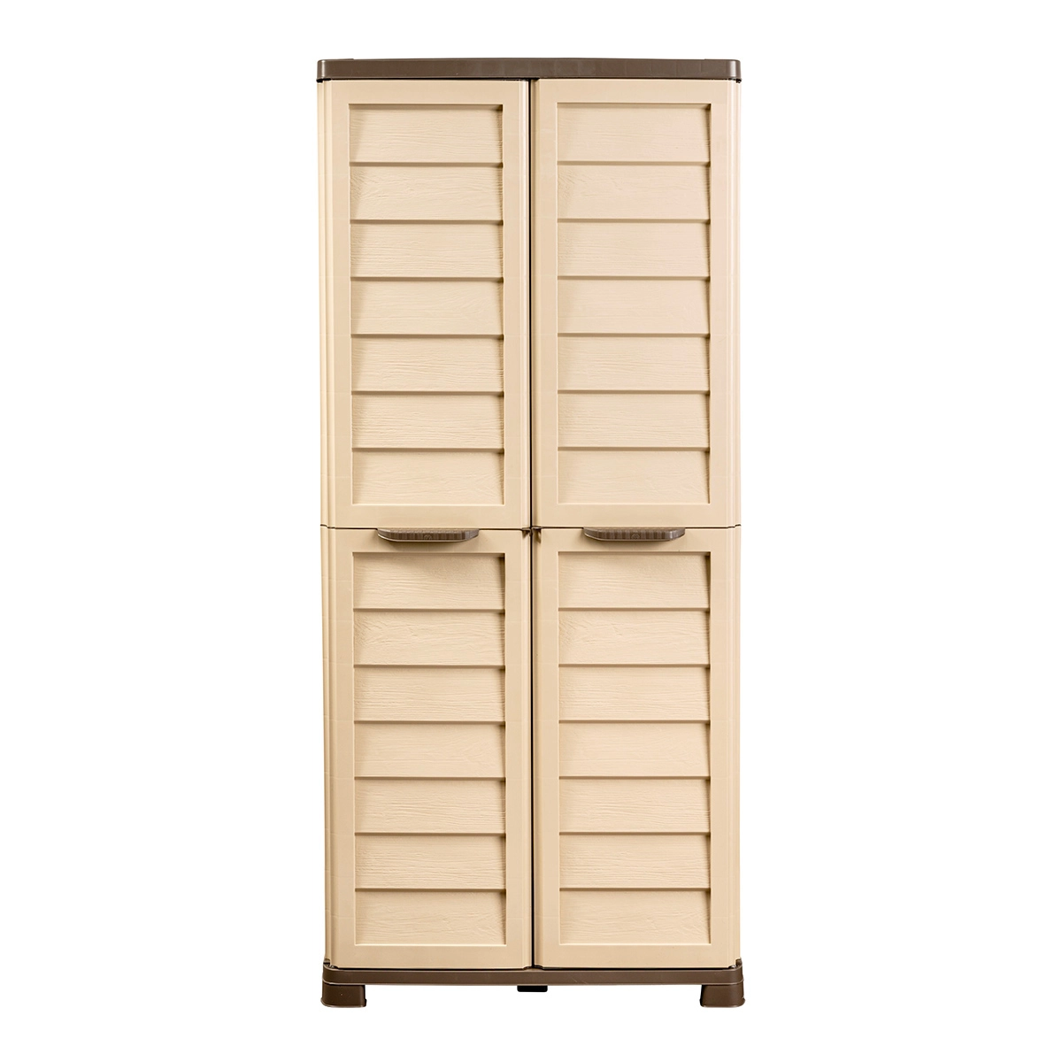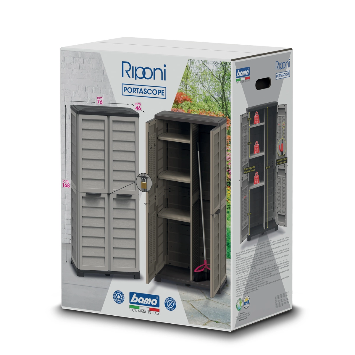 Armadio portascope versatile per uso interno ed esterno, realizzato in resina 100% riciclabile con ante a battente e tre ripiani regolabili in altezza che supportano fino a 20 kg ciascuno. Dotato di pratico divisorio interno per riporre scope, secchi e rastrelli. Facile da montare senza bisogno di attrezzi. Garantito 5 anni.