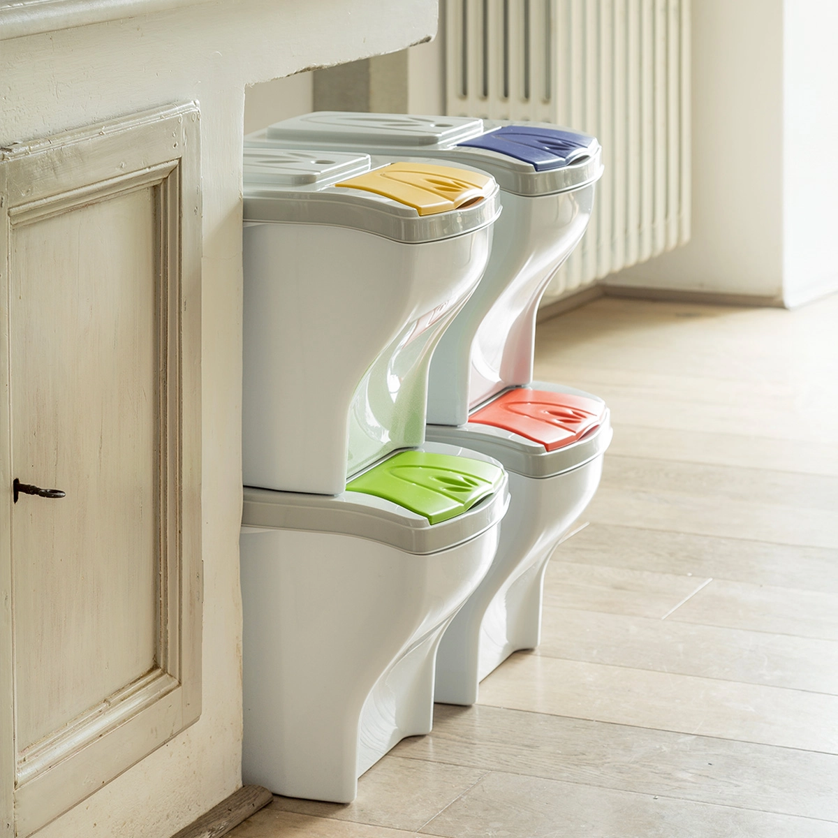 Bidoncini per la raccolta differenziata studiati per riciclare con ordine l’umido, la carta, la plastica, il vetro e i rifiuti urbani residui. Merito dei 4 contenitori da 20 litri l’uno.