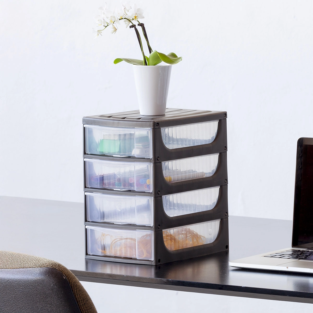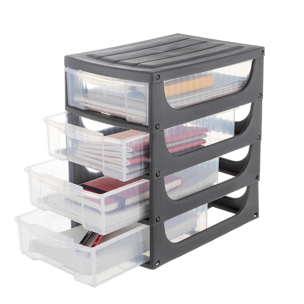 I 4 cassetti scorrono con facilità e aiutano a tenere separati viti, penne, minuterie e altri oggetti utili per l’ufficio o il fai da te. La trasparenza del materiale, aiuta a individuare subito il contenuto.