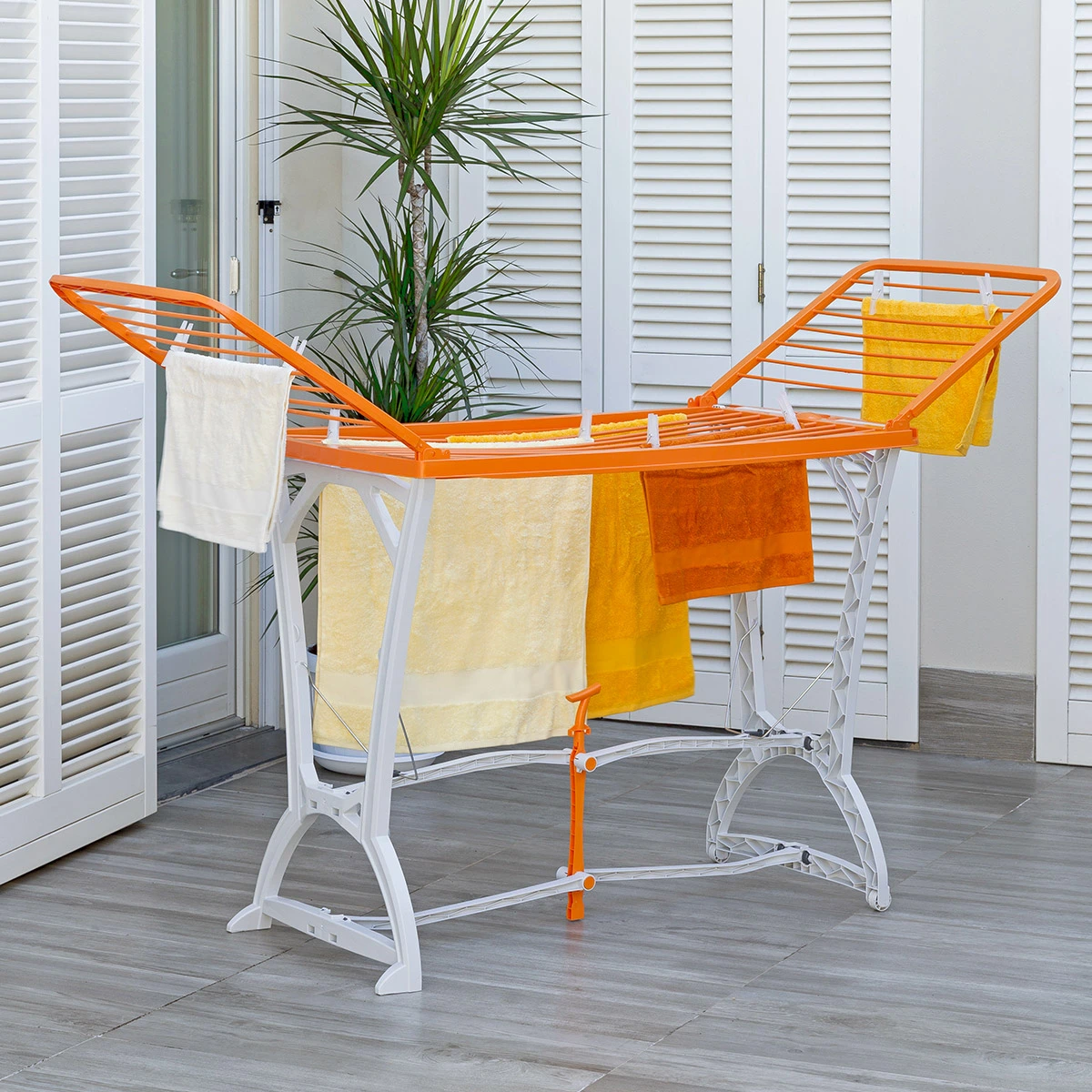 Stendino per biancheria pieghevole in resina con ruote e blocco sicuro del piedistallo.
