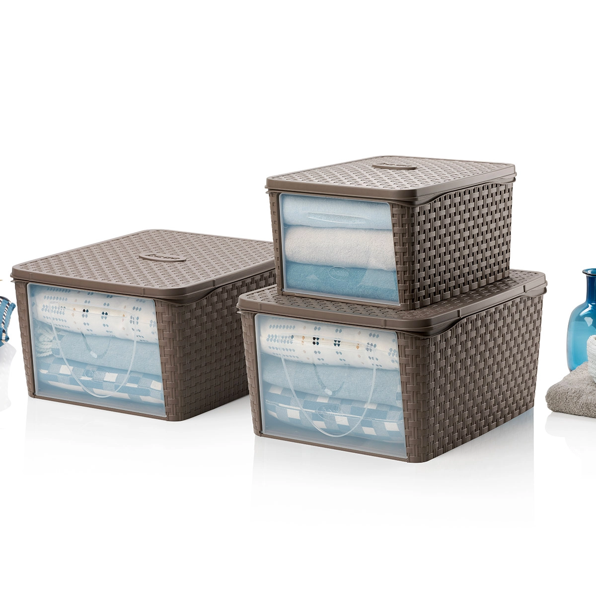 Linea di scatole in plastica trasparente per contenere oggetti.