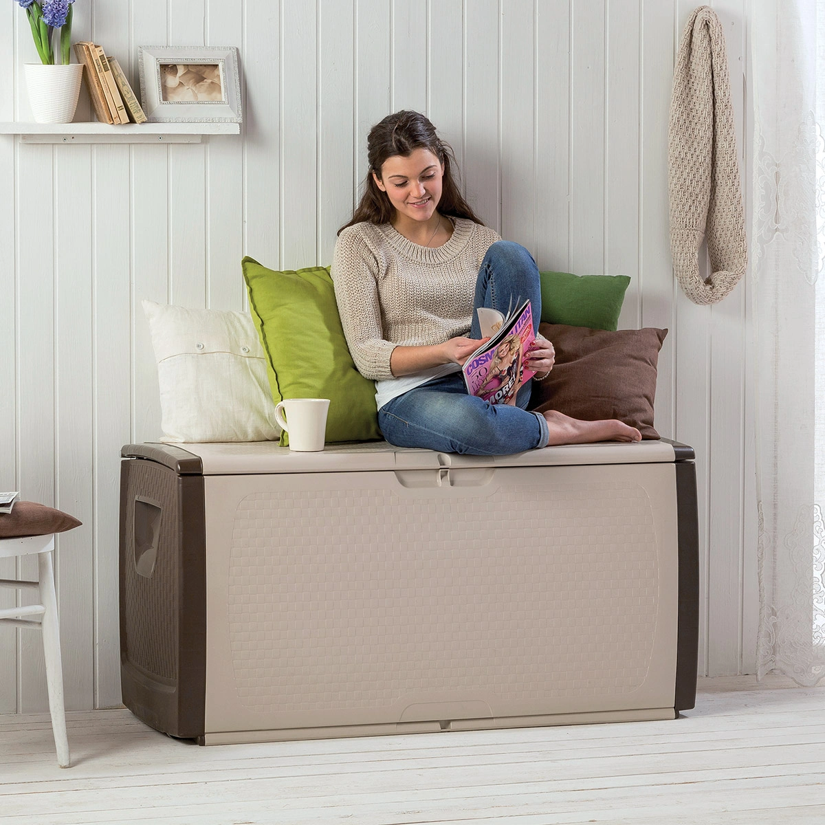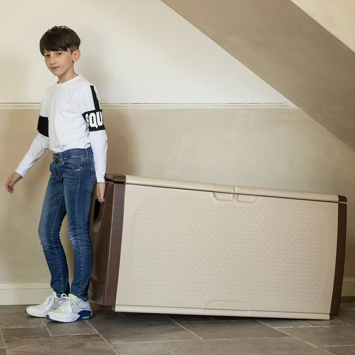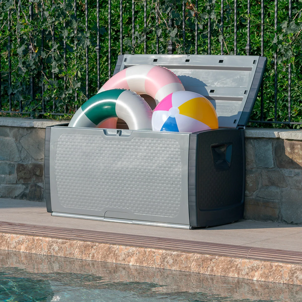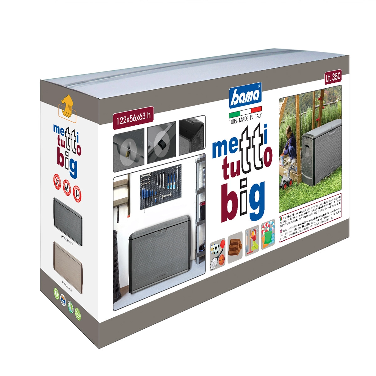 Con la straordinaria capienza di 350 litri, è l’ideale per riporre giochi estivi, coperte, piumoni, cuscini, utensili da lavoro, attrezzi e accessori da giardinaggio sia all’esterno che all’interno