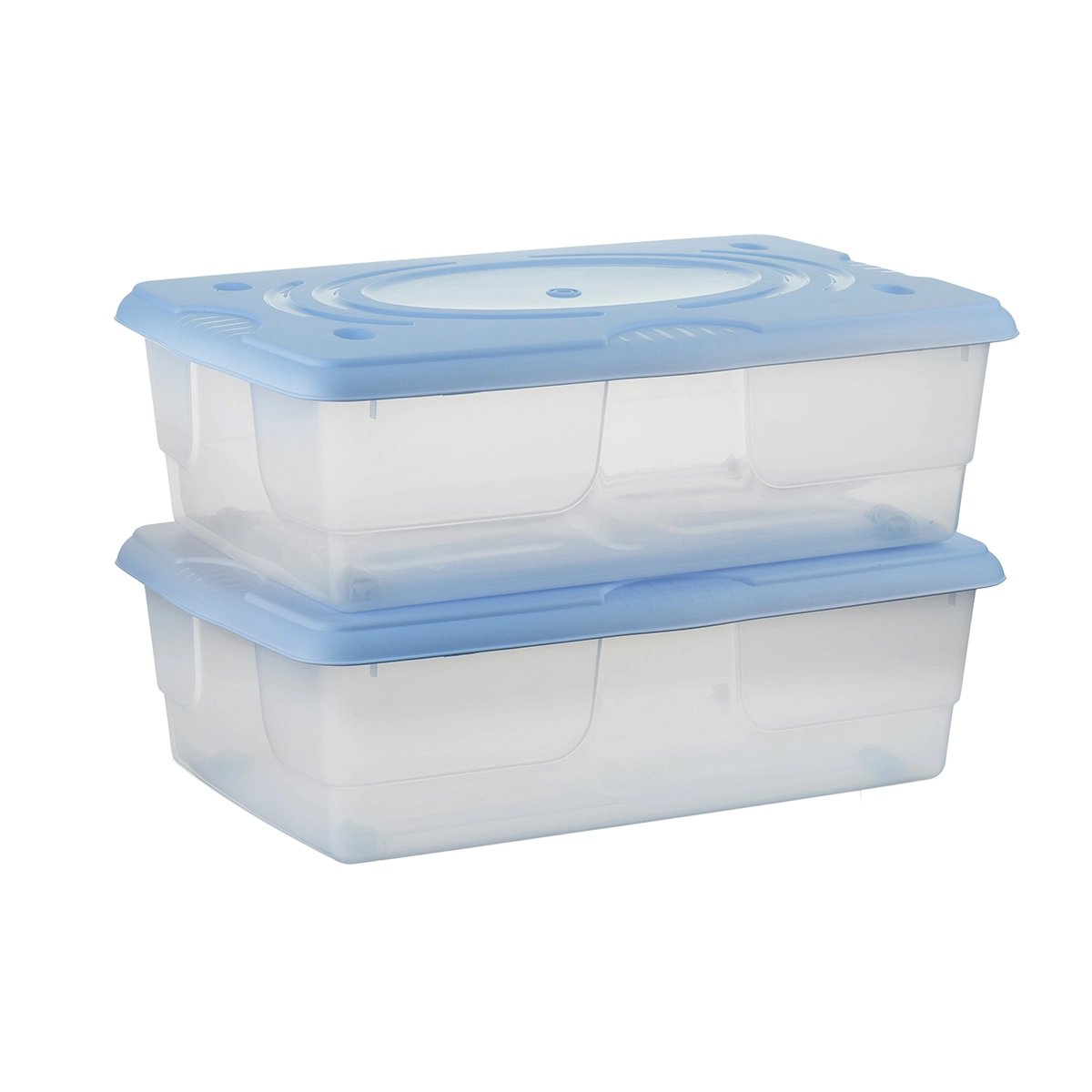 Contenitori in plastica sovrapponibili con apertura a cerniera e chiusura a scatto.
