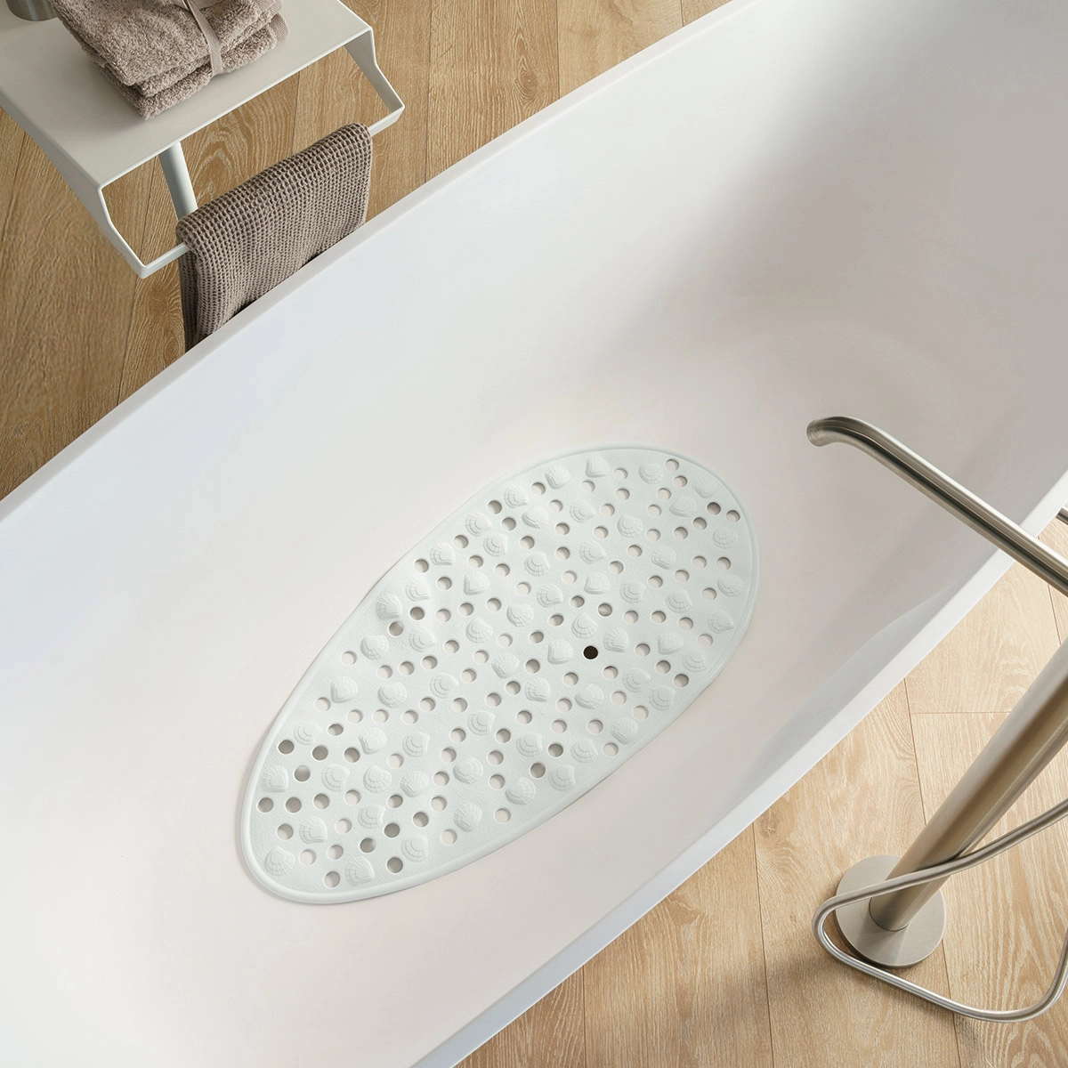 Tappeto bianco per vasca con ventose ad alta tenuta e superficie antimuffa.