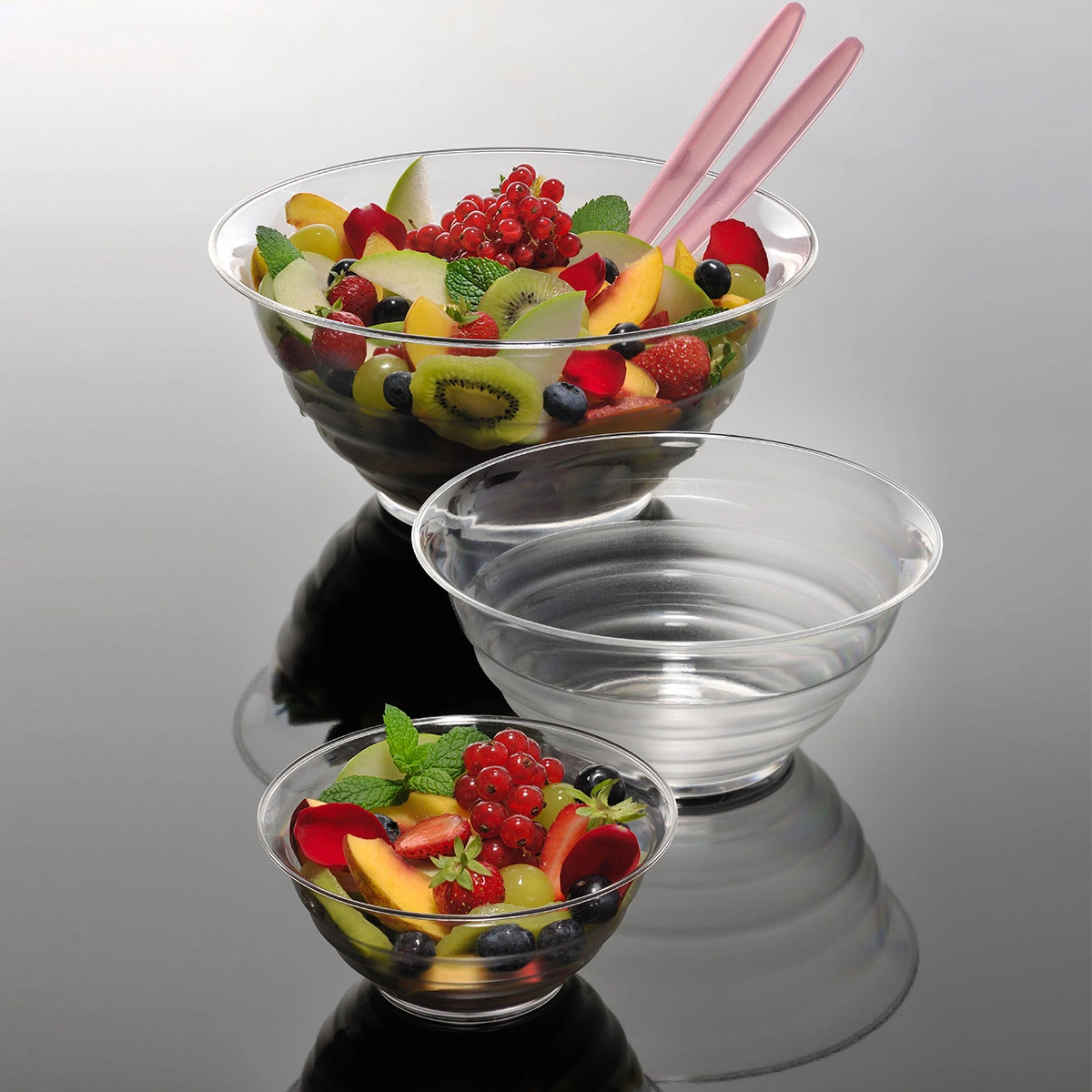 Insalatiera effetto cristallo perfetta per insalate, macedonie, verdure a julienne, patatine, pop-corn e stuzzichini. È utile per preparare delizie e per servirle con allegria.