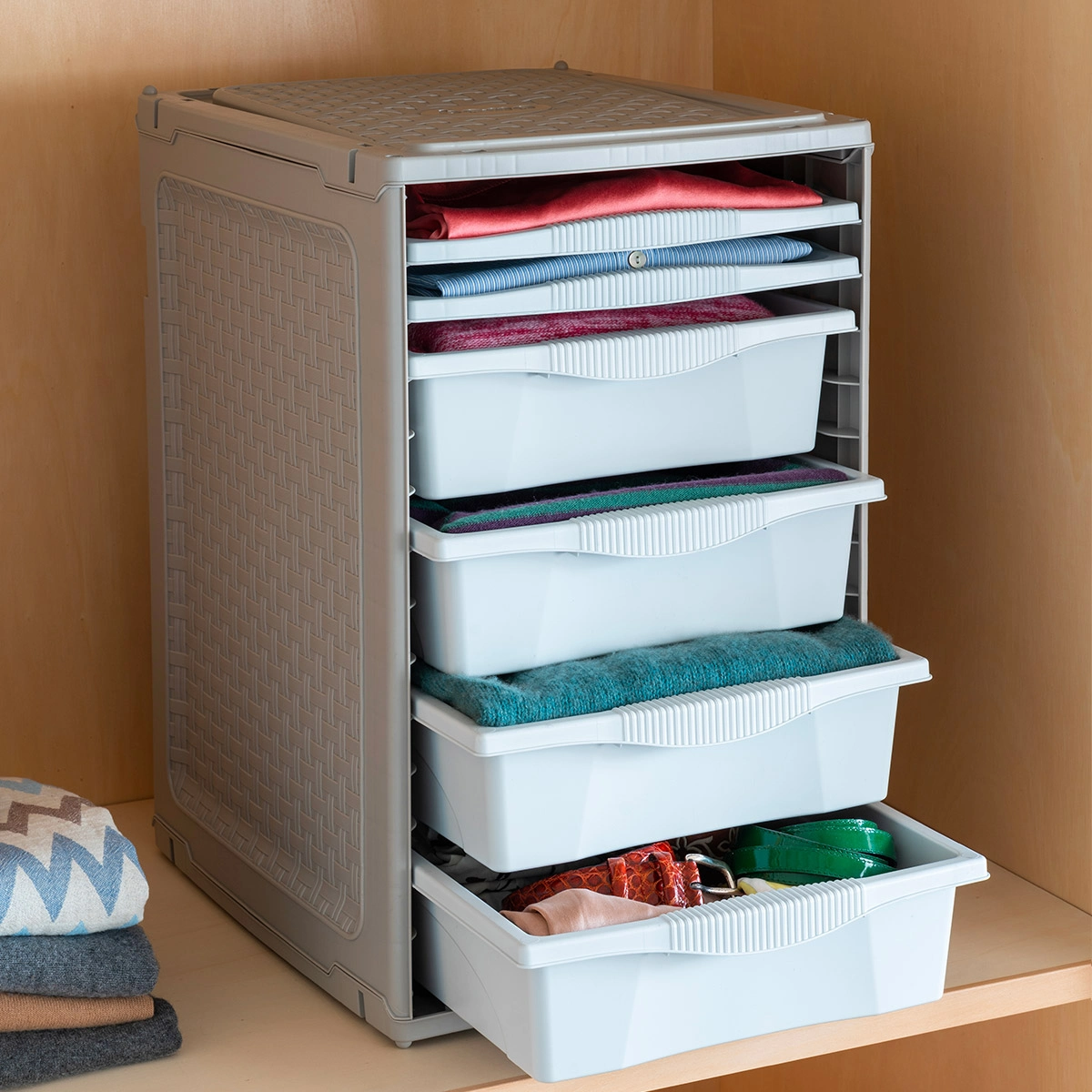 Organizer a cassetti per armadi e scaffali. Ideale per tenere in ordine camicie, maglioni, biancheria intima, cinture e accessori. Un must-have del guardaroba perfetto!