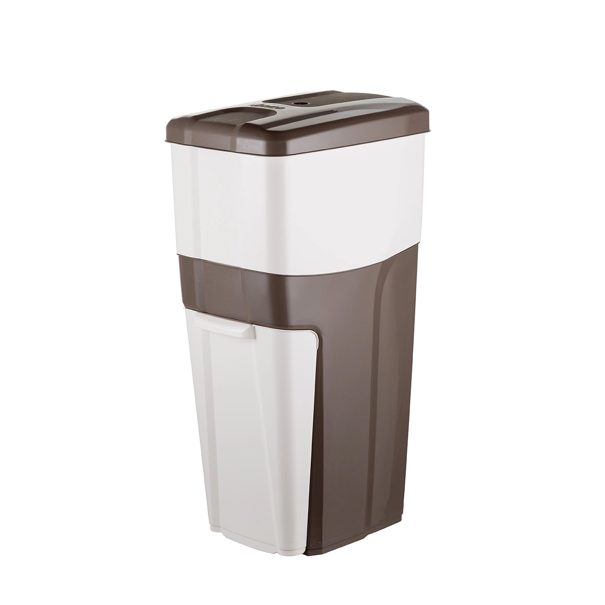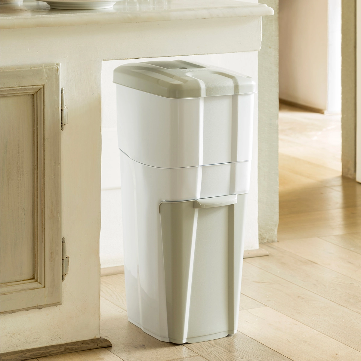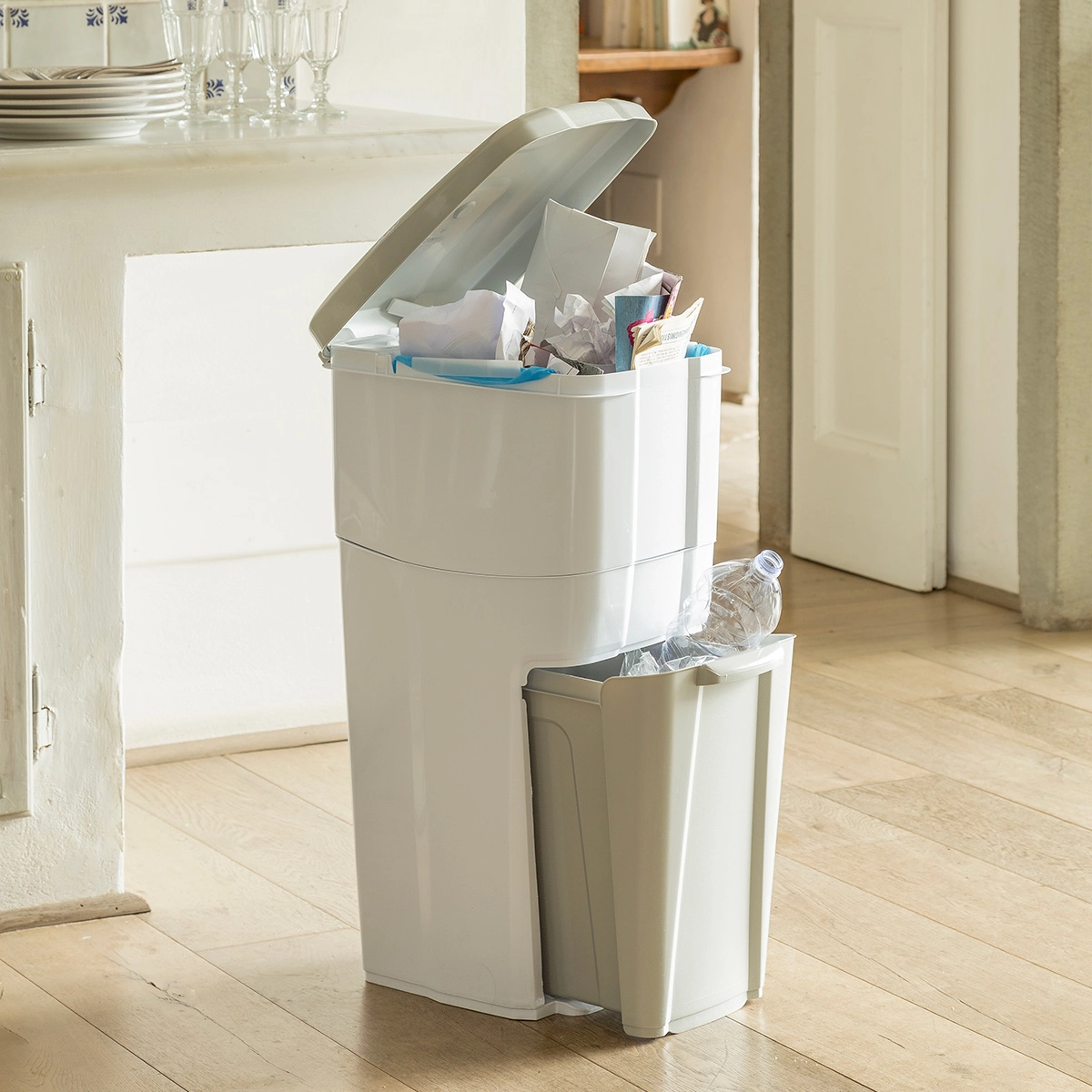 Il contenitore inferiore a cassetto (18 lt) è l’ideale per raccogliere la plastica, la carta e il vetro. Lo scomparto superiore (16 lt) con coperchio è studiato per contenere l’umido o l’indifferenziato.