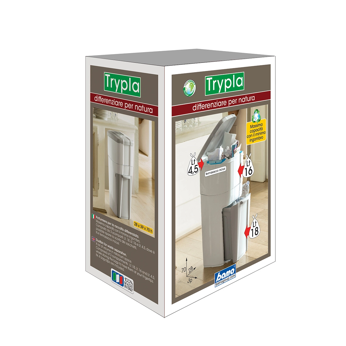 Il vano per i sacchetti (4 lt) e i 4 fermasacco in dotazione, completano Trypla con tutta la praticità necessaria senza dimenticare il design. La scelta perfetta sia dentro che fuori casa.