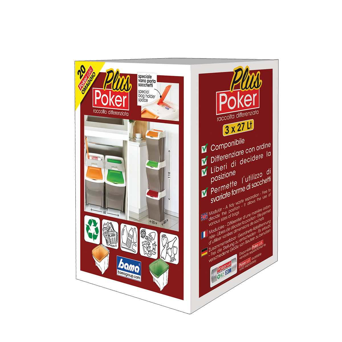 Disponibile in set da 3 o 4 pezzi in colori assortiti, i bidoni per la differenziata Poker plus sono realizzati in resine riciclabili al 100%: il nostro contributo per un mondo migliore. Confezionati in una scatola robusta con stampa digitale e pronta alla spedizione.