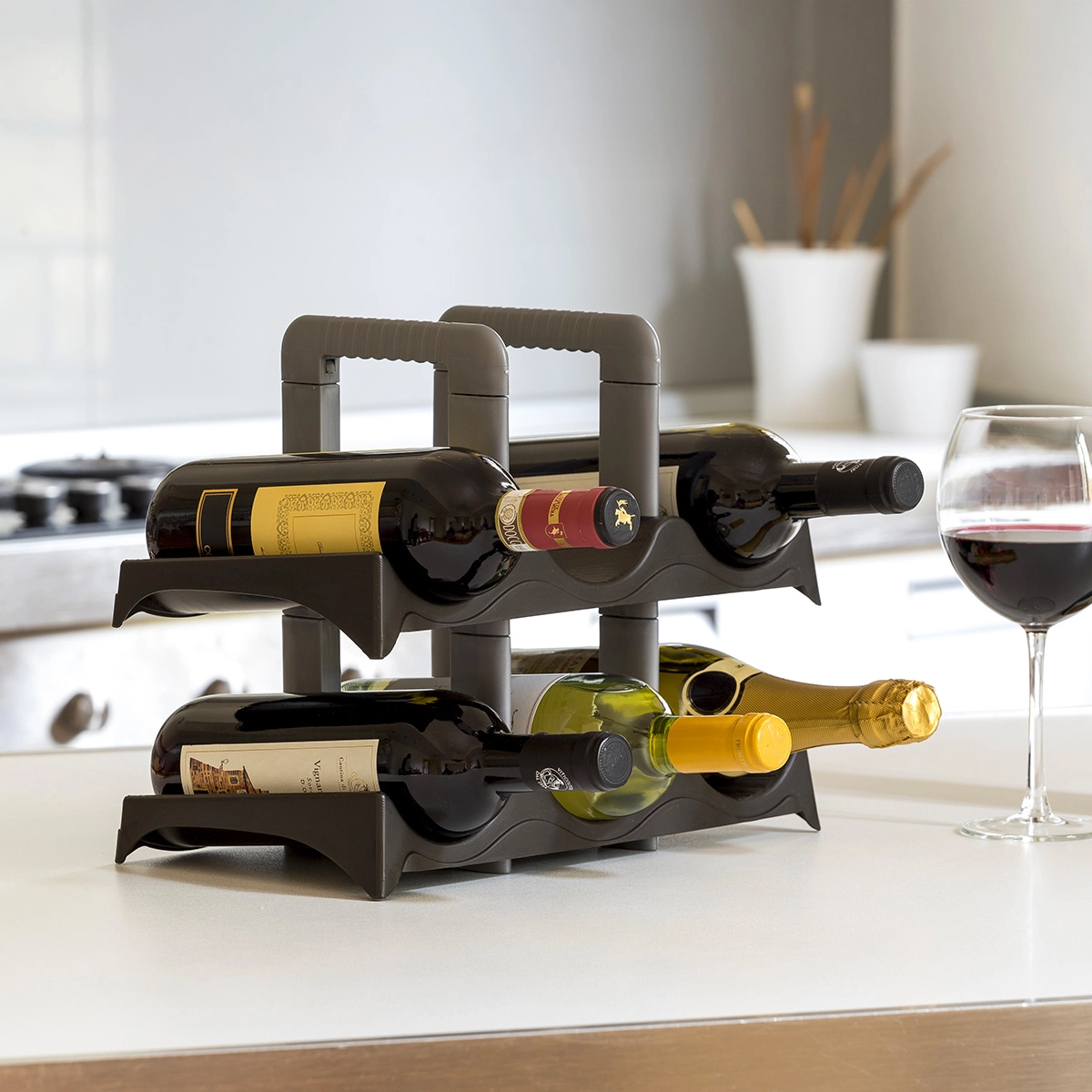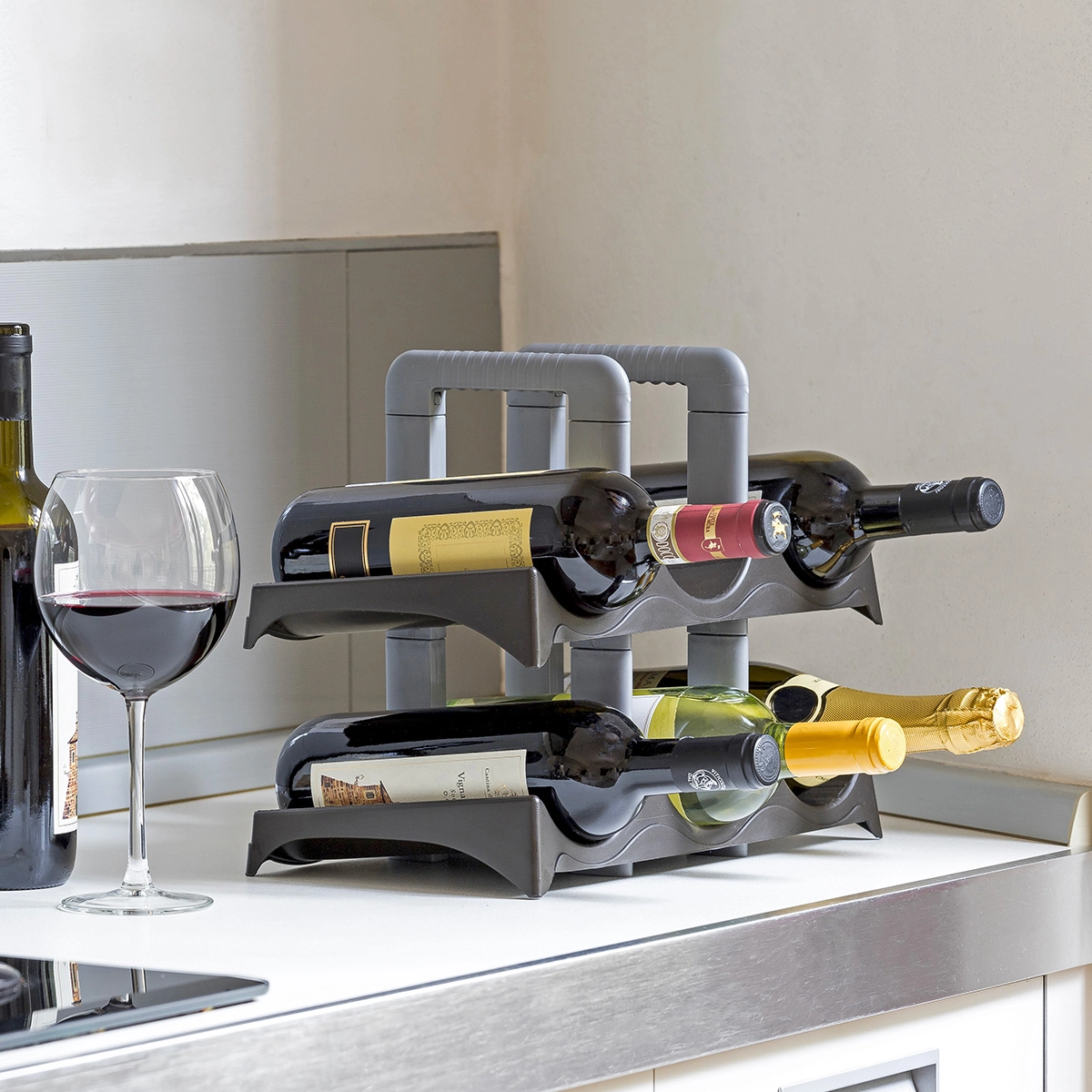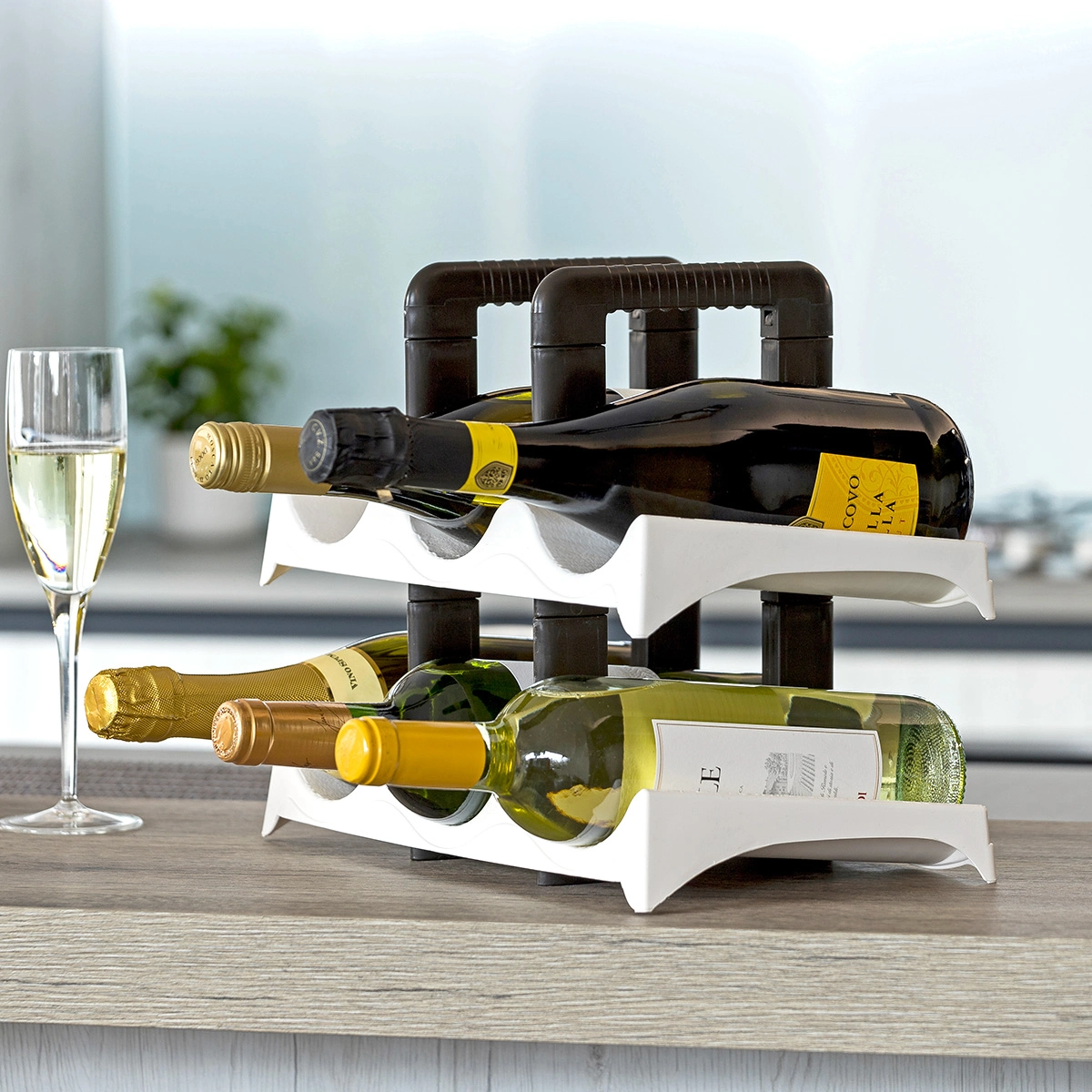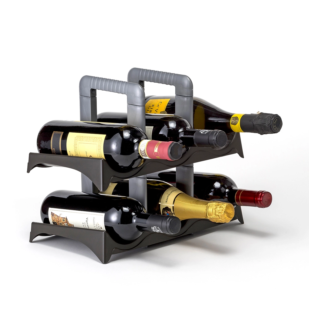 Portabottiglie in plastica per vino, spumante o champagne. Può contenere fino a 6 bottiglie su due livelli leggermente inclinati per estrarle e inserirle con facilità.